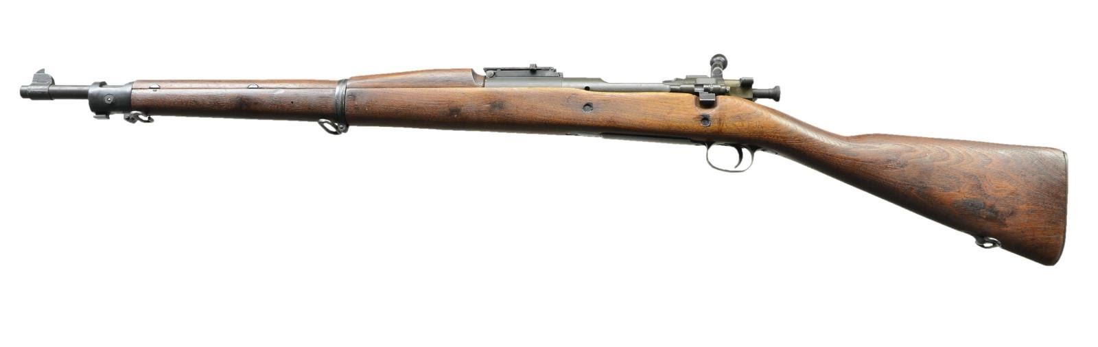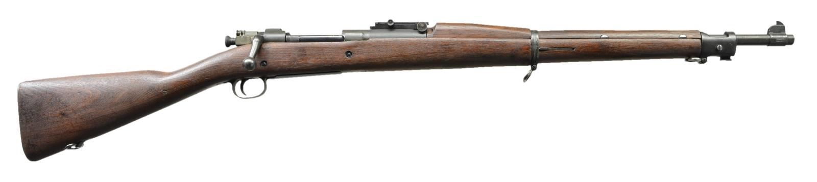 Cal. 30-06. S #3103098. Bbl. 23". Bbl. is marked behind front sight "RA" flaming bomb & 5-42. Rear sight base w/out lighting cuts. All milled furniture. Remington marked bolt handle & front band. Ladder rear sight graduated to 2850yds. Blade front sight. Walnut stock set w/ two recoil bolts & w/out grasping grooves. Left side of stock marked w/ "RA", ordnance wheel & unboxed "FJA" marking. Left side of butt marked w/ boxed "O.G." Ogden arsenal marking. Bottom of wrist marked w/ circled "P" firing proof. CONDITION: arsenal reworked walnut stock shows handling marks & dings. Metal retains 85% gray arsenal parkerized finish with some light pitting on rear sight base, a few spots of light oxidation, silvering on the exposed edges and scattered thinning. Good shiny bore w/ some frosting but strong rifling. (22-2360/MJC). CURIO. $400-600.