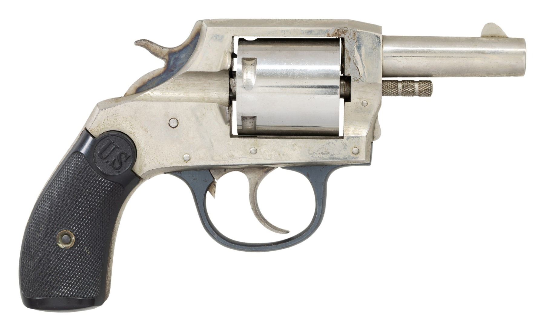 Cal. 38 S&W. S# F2896 (under left grip). Mfg. by Iver Johnson 1911-1935 as mail order sale. Bbl. 2.5". Fixed sights. 6 Shot cyl. Nickel finish. Hard rubber grips. CONDITION: good nickel with areas of peeling finish to oxidized metal. Very good blue & case colors with peppery oxidation. Very good grips w/ 1 crack on back of right panel. Good strong bore. (25-2703/MD). CURIO. $40-60.