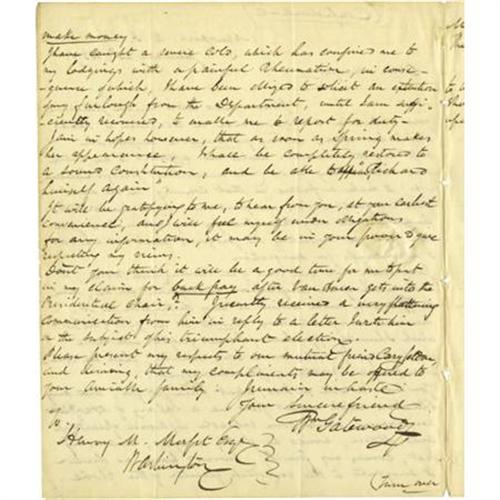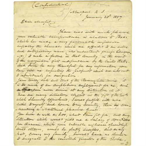 <B>U.S. Recognition of Texas Independence: William Gatewood Autograph Letter Signed</B></I> "<I>Wm. Gatewood</B></I>," 2.5 pages, 8" x 10", front and verso, with integral leaf addressed "<I>To/Henry M. Morfit Esq./Counsellor at Law/Washington/D.C.</B></I>" and red circular "<I>New Port, R.I. Jan 25 PAID</B></I>" postmark. Newport, R.I., January 23, 1837. Marked "<I>Confidential</B></I>" by Gatewood. In July 1836, both U.S. houses of Congress passed resolutions "that the independence of Texas ought to be acknowledged by the United States whenever...information should be received that [Texas had] a civil government capable of...fulfilling the obligation of an independent Power." President Jackson sent Henry M. Morfit to Texas as his agent. Morfit reported favorably but Jackson urged against recognition of Texas independence because the people of Texas resolved to seek admission of their nation to the Union as a state once recognition occurred. The President felt that it would seem that the United States was acknowledging Texas independence for the sole purpose of acquiring her territory. Congress agreed with the President. In this letter, Gatewood, a captain in the U.S. Revenue Cutter Service, writes to his friend Morfit about Texas, telling him he is "<I>really sick and tired</B></I>" of his job and would like to go to Texas because of the "ch<I>ances which are afforded to an active and enterprising man (who understands foreign languages) to make a fortune in that country in the event of the recognition of its independence by the United States...Don't you think it will be a good time for me to put in a claim for back pay after Van Buren gets into the Presidential chair? I recently received a very flattering letter from him in reply to a letter I wrote him on the subject of his triumphant election...</B></I>" Van Buren succeeded Jackson seven weeks after this letter was written. In very fine condition.<B>Condition Report:</B> <BR><BR><b>Shipping:</b> Flat Material, Small (<a target="_blank" href="http://www.heritageauctions.com/common/shipping.php">view shipping information</a>)