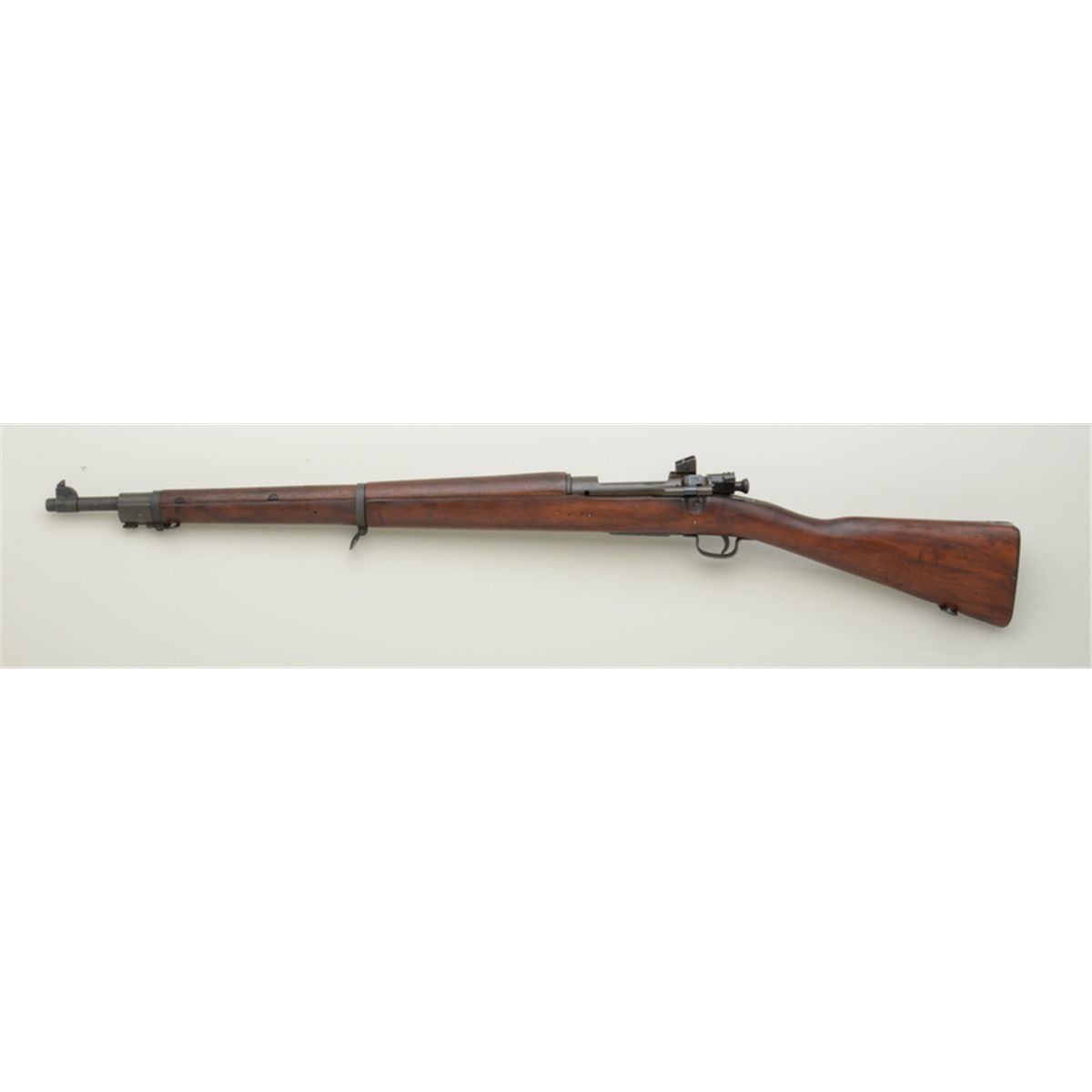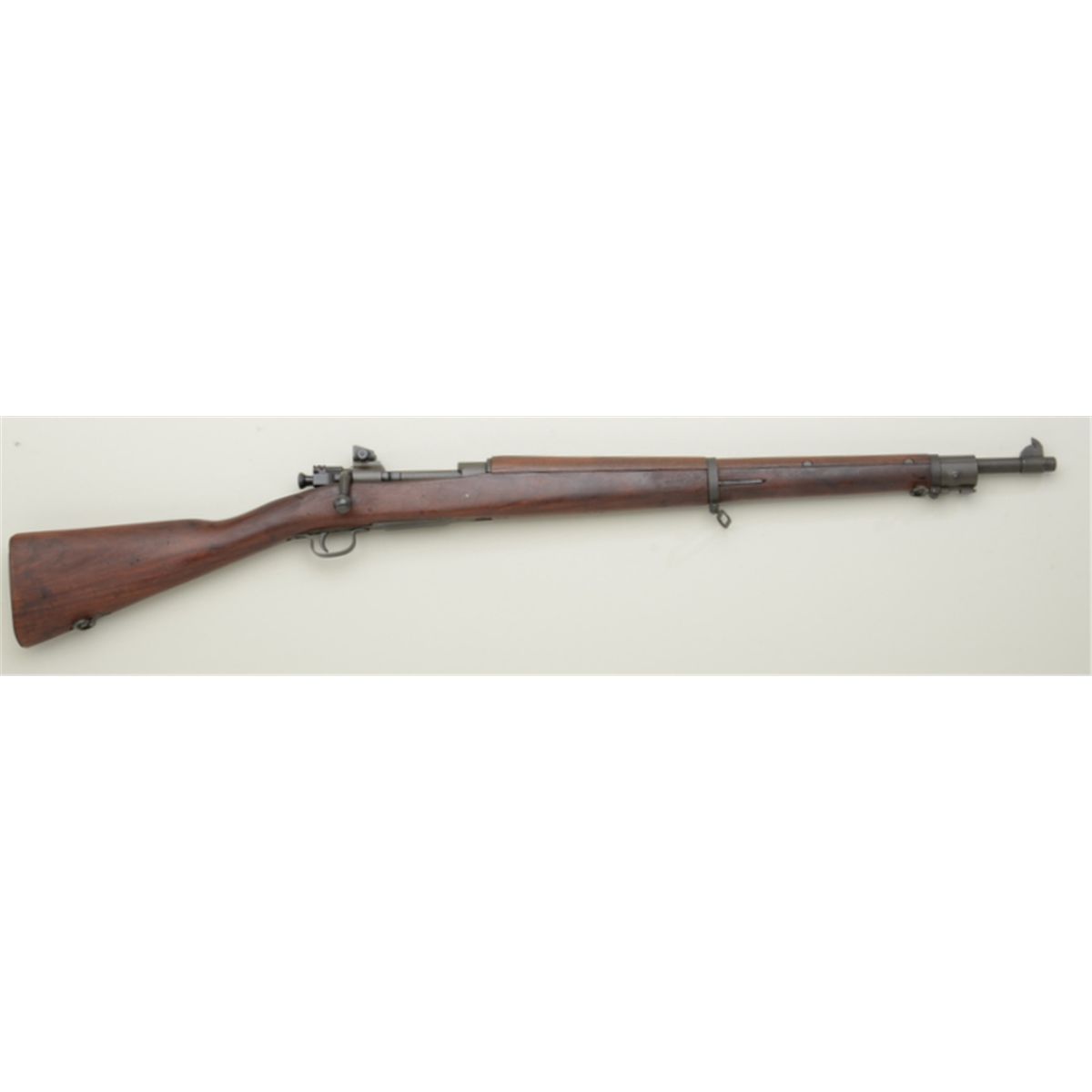 U.S. Remington Model 03-A3 bolt-action military rifle, .30-06 cal., 24-1/2” barrel marked S C with flaming bomb and dated 2-42, military finish, wood stock, sling swivels, #3582266. This gun is in overall fine toexcellent condition showing the majority of its greenish military finish, fine bore, crisp action, sharp markings, fine wood stock with circle P behind trigger guard and RA, SA in box, crossed cannons and FJA inspectorcartouches on the left side of the butt stock. Est.: $500-$1,000.