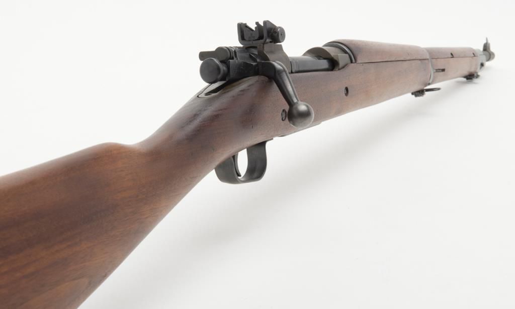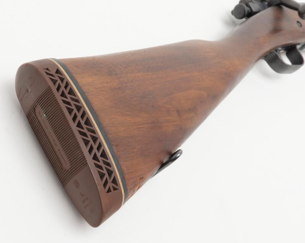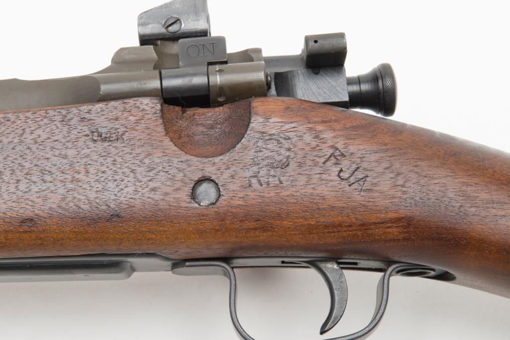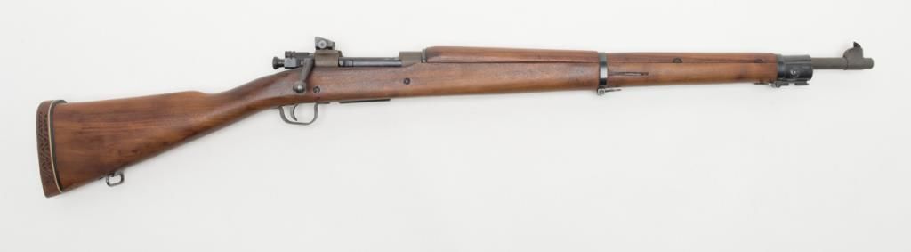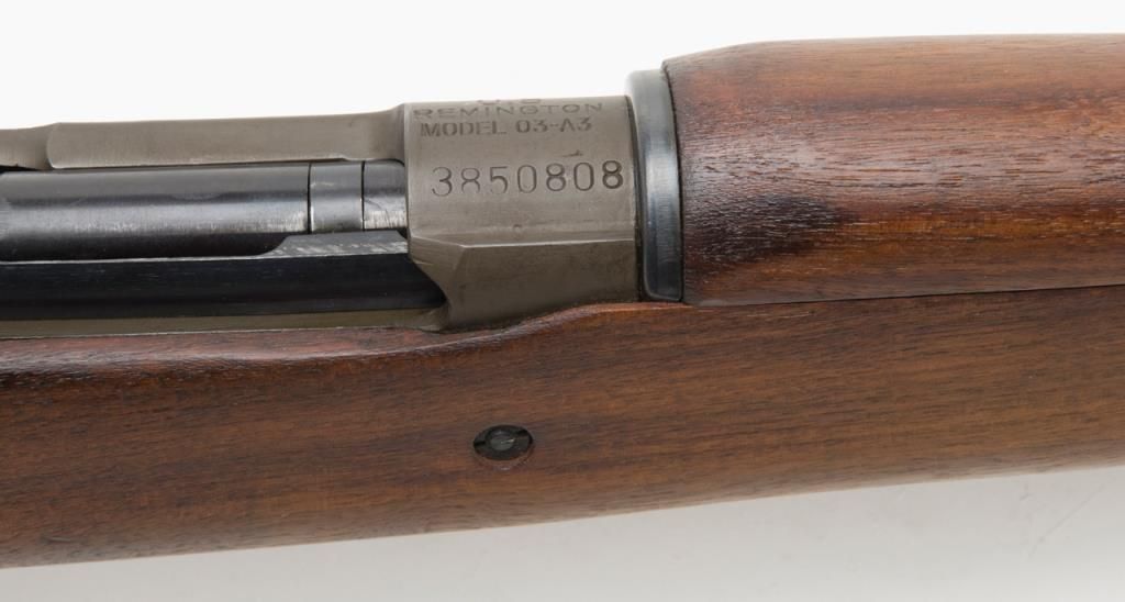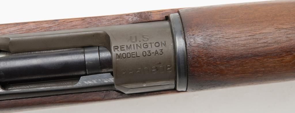 U.S. Remington Model 03-A3 bolt action rifle, 30-06 caliber, Serial #3850808. The rifle is in overall very good condition with a 24” barrel dated 9-43. The barrel retains the majority of its military finish with the “R.A.” and flamingbomb marks. The action shows nearly all of its military finish as well. The smooth wood stocks are in overall very good condition with numerous cartouches and inspectors marks including “RA” and “JFA” amongst others. At some point during theperiod of use, someone has added a White Line ventilated rubber butt pad. The bore is very good, the action crisp and markings sharp on this rifle. (C+R). Est.: $250-$500