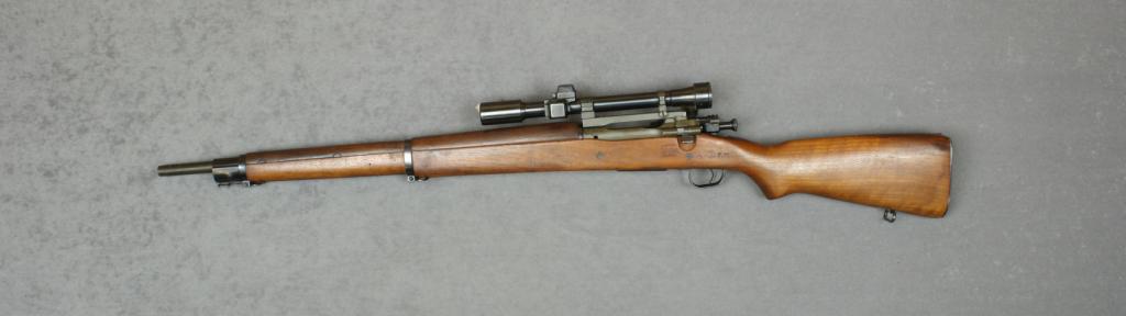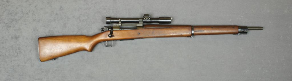 U.S. Remington Model 03-A3 bolt-action sniper rifle with M84 scope on Redfield base, .30-06 cal., 24” barrel dated “8-43”, offset receiver markings which is correct for a sniper rifle, parkerized finish, wood stock,#3420112. This gun is in overall fine to excellent condition showing the majority of its military finish, fine bore, crisp action, sharp markings, excellent wood stock with circle P proof at semi-pistol grip, leftside of stock also inspected “BA-HBA” in rectangle, “RA”, crossed cannons and “JFA”; fine optics on scope, sling swivels present. Est.: $2,000-$4,000.