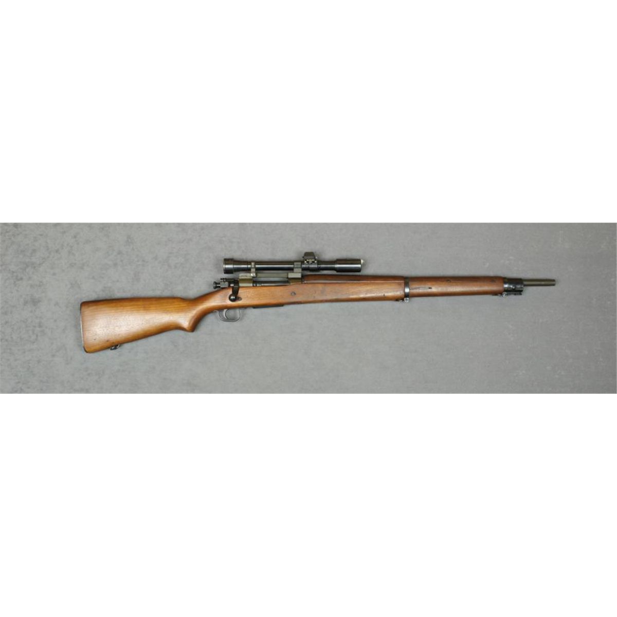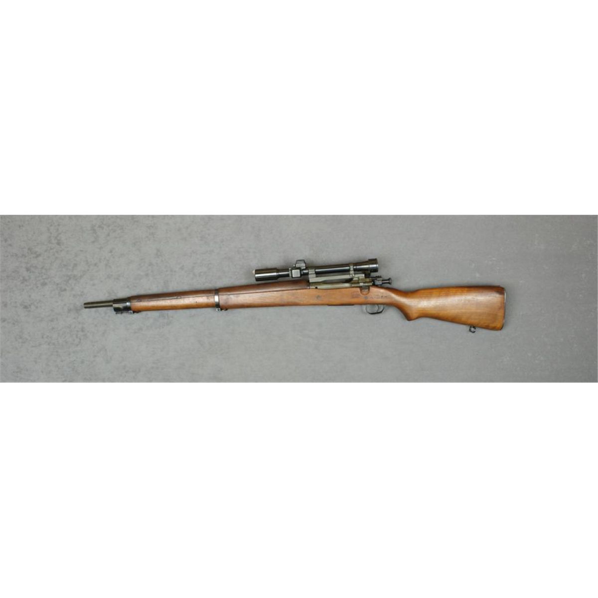 U.S. Remington Model 03-A3 bolt-action sniper rifle with M84 scope on Redfield base, .30-06 cal., 24” barrel dated “8-43”, offset receiver markings which is correct for a sniper rifle, parkerized finish, wood stock,#3420112. This gun is in overall fine to excellent condition showing the majority of its military finish, fine bore, crisp action, sharp markings, excellent wood stock with circle P proof at semi-pistol grip, leftside of stock also inspected “BA-HBA” in rectangle, “RA”, crossed cannons and “JFA”; fine optics on scope, sling swivels present. Est.: $2,000-$4,000.