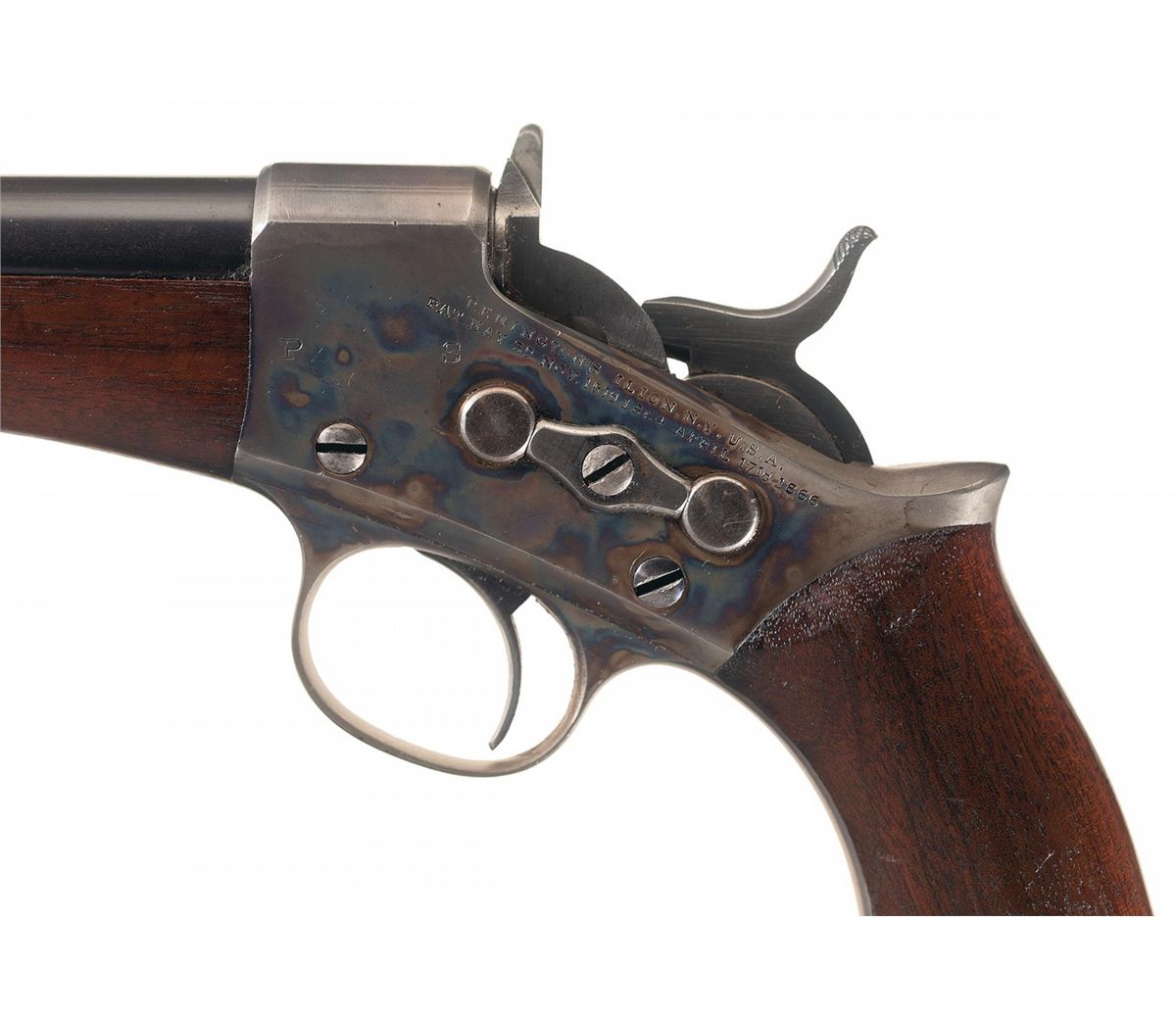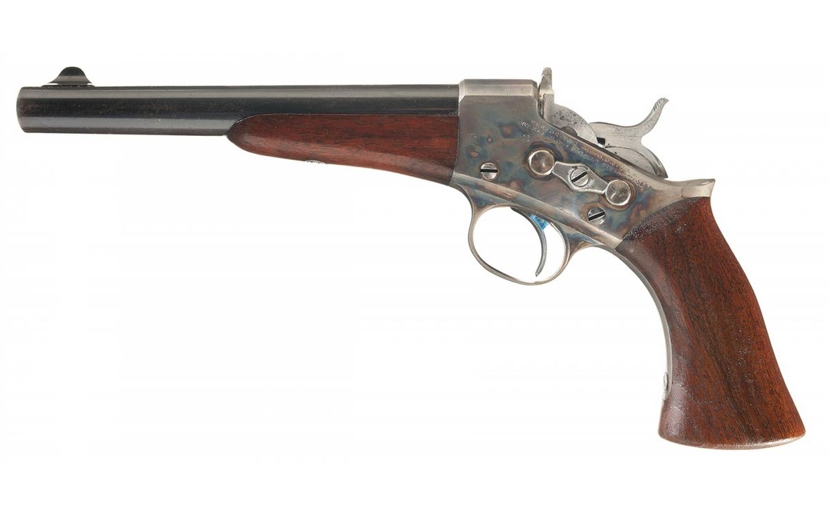 Manufactured circa 1872 to 1888 with a total production of approximately 6,000, with approximately 5,000 sold to the U.S. government. The pistol has an 8" blue barrel, casehardened frame with distinctive hump on the back strap, the trigger is niter blue and bright hammer and breechblock. The left side of the frame is marked "REMINGTON'S ILION N.Y. U.S.A./PAT MAY 3D NOV 15TH 1864 APRIL 17TH 1866" and stamped with a "P" and "S" below and ahead of the marking. The pistol is mounted with a smooth walnut forearm and one piece smooth grip with a faint boxed inspection cartouche on the left. Comes in a contemporary wooden case with green fitted lining, an original cartridge and fired case.