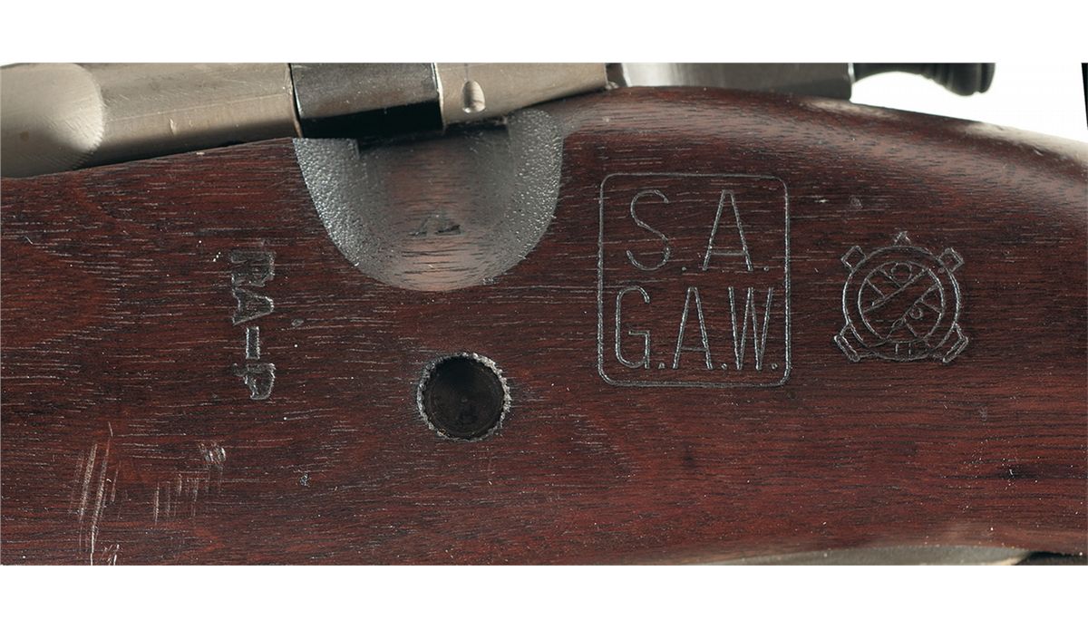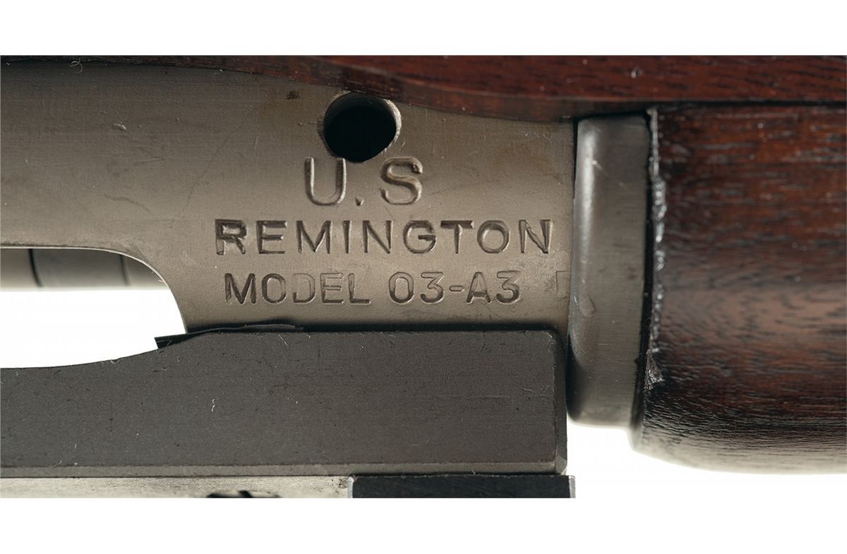 Manufactured by the Remington Arms Company c.1944. The rifle is fitted with a Lyman Alaskan telescopic sight with fine cross-hair reticle, parkerized scope rings and Redfield scope base, milled bolt handle and walnut pistol grip "C" stock. The barrel is correctly not fitted with a front sight blade or base and the scope mount replaces the rear sight. The rifle has the standard Model 1903-A3 stamped buttplate, barrel bands, sling swivels, follower and trigger guard. The receiver has the distinctive rolled marking "U.S./ REMINGTON/ MODEL 1903-A3" on the left side and the serial number "3423486" on the right side of the receiver. The barrel is roll stamped "RA" above the Ordnance Shell & Flame insignia and the date "3 44". The left side of the stock is stamped with the Springfield Armory final inspection mark "S.A./G.A.W." in a rectangle followed by the Ordnance Corps escutcheon. The arsenal re-build mark "RA-P" is stamped ahead of the SA markings. An circled block "P" proof mark is stamped on the inside of the pistol grip. The left side of the blue telescopic sight is roll stamped with the Lyman "ALASKAN" and "ALL WEATHER" trademarks, patent dates and the serial number "B5823". The rifle has been Arsenal overhauled and has a gray parkerized finish on all components. Most Model 1903 A-4 Sniper rifles were Arsenal overhauled following WWII. The Model 1903 A-4 rifles saw limited service in the Korean Conflict and were supplied to many U.S. Third World allies during the Cold War. The vast majority of M1903 A-4 Sniper Rifles sold to the public thru the Director of Civilian Marksmanship had the original telescopic sights removed before sale.