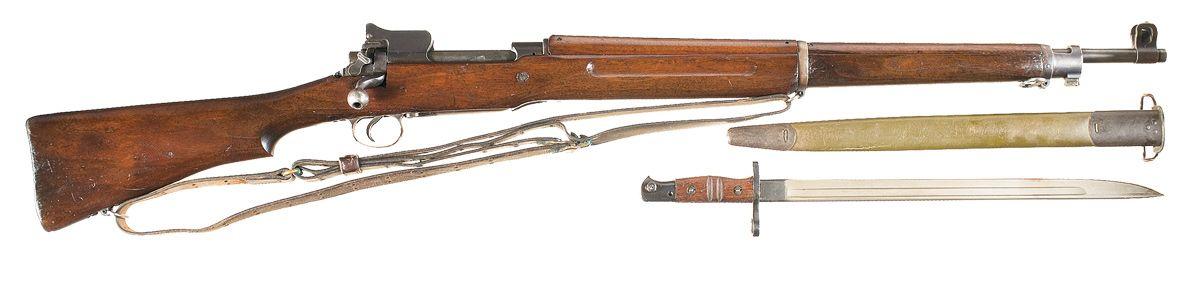 This is an example of a Remington Model 1917 rifle with Remington Model 1917 Bayonet, scabbard and Model 1907 russet leather sling. The rifle has the original deep blue finish with black walnut stock and handguard. The receiver is marked: "U.S. / MODEL OF 1917 / REMINGTON" over the serial number. The barrel is marked "R / ordnance bomb / 9-18". The ordnance bomb is also stamped on the left side of the receiver rail and on the top of the bolt handle. The provisional "Eagle Head" Ordnance inspection mark is stamped in two places on the top of the receiver rail and on the floor plate hardware. The "R" (Remington) identification mark is stamped on the rear sight leaf, on the bolt handle, front sight blade and front sight stud and an "E" is stamped on the cocking knob. The stock forend tip has a small plate hammered into it "22". The bottom of the stock ahead of and behind the trigger guard are stamped "4 / E" and "E / 4" respectively with the addition of a "S" in the grip area. The left side of the stock above the trigger guard is stamped "RA-P". The rifle is fitted with a WWI Model 1907 leather sling with brass fittings. The Model 1917 Bayonet has the original two-tone finish with gray-phosphate blade and blued ricasso, hilt and guard. The two-piece walnut grip has two vertical grasping grooves. The obverse of the blade is dated "1917" over "REMINGTON" in a circle. The reverse is stamped with the 'Shell and Flame' above "U.S." and a eagle head inspection mark. The bayonet scabbard has a green leather body with blued steel tip and throat, stamped "M.F.W.".