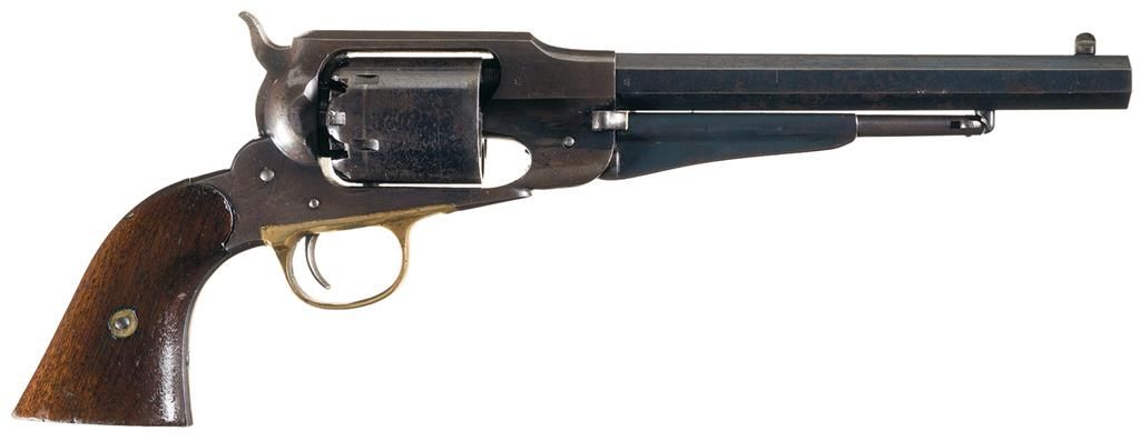 Pinched blade front and frame groove rear sights, with "PATENTED SEPT. 14. 1858/E. REMINGTON & SONS.ILION NEWYORK.U.S.A./NEW-MODEL" on the top flat of the barrel, and single letter sub-inspection marks on the left flat, left side of the frame, cylinder and on the underside of the grips. Brass trigger guard and smooth 2-piece grips with "GR" cartouche.