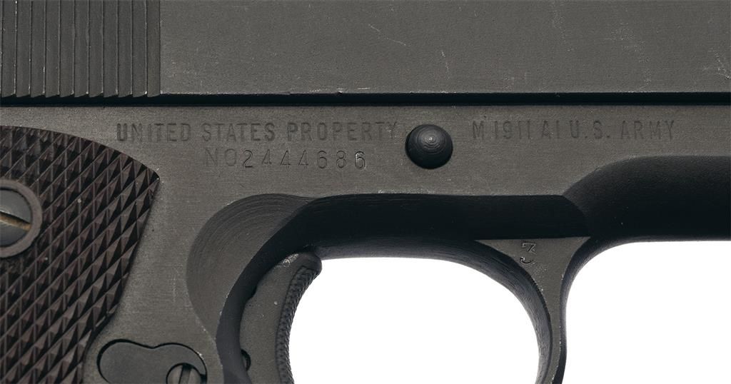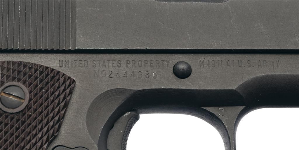 Made in 1945. Fixed sights, with "REMINGTON RAND INC./SYRACUSE, N.Y. U.S.A." and "P" on the slide, "NO" style serial number marking, stamped trigger, thin hammer, serrated slide catch, checkered thumb safety, serrated arched mainspring housing, Keyes Fiber grips, and a replacement Flannery barrel. The frame does not have an Atwood inspection mark, but is "UNITED STATES PROPERTY" marked. With a brown cardboard box with military-style nomenclature on the lid.