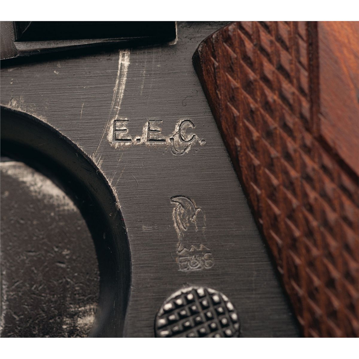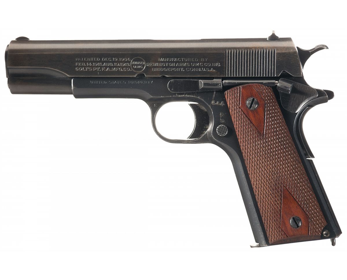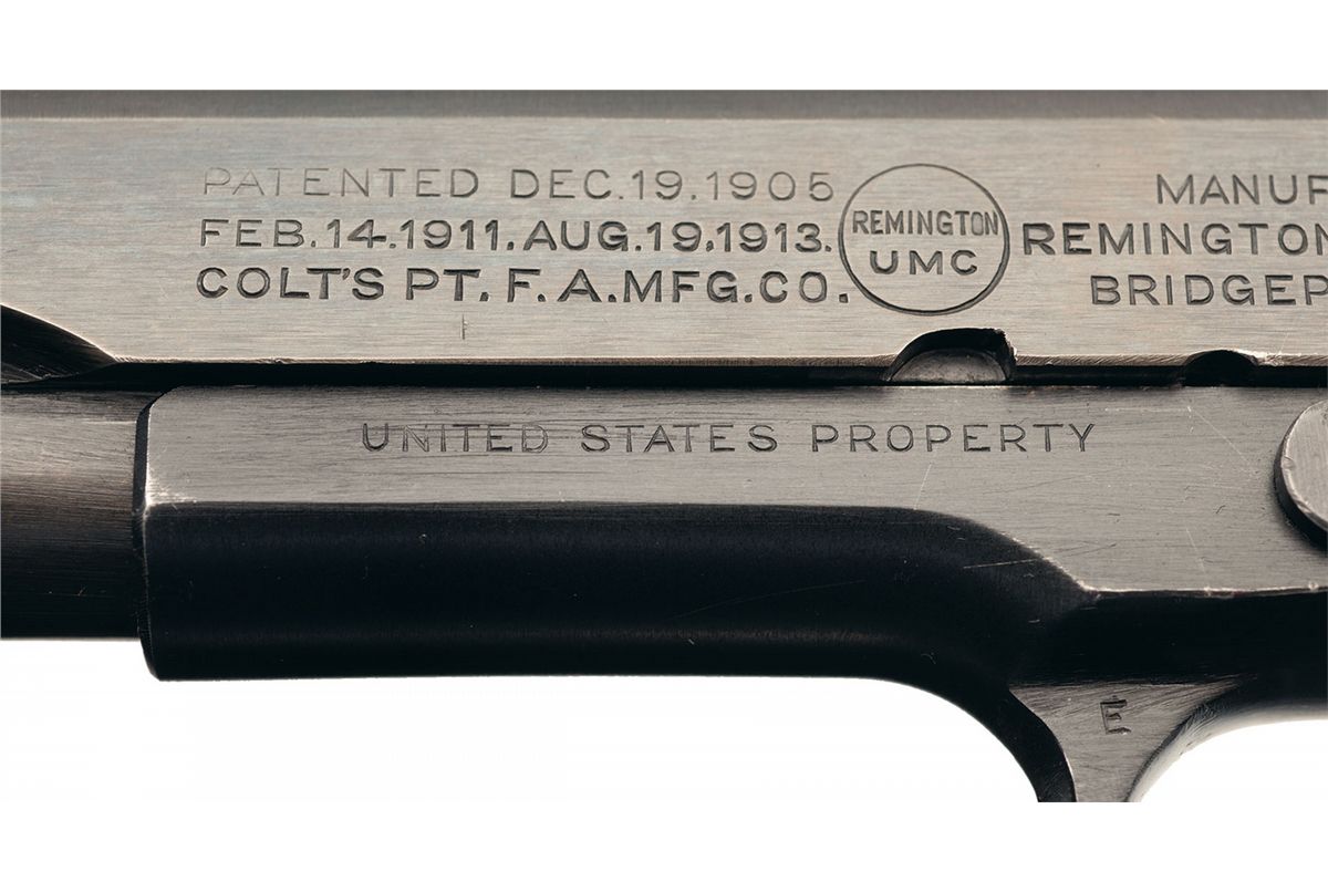Produced in 1918 as part of a 2 year, independently numbered run by Remington-UMC. Fixed sights with the three line, two block patent and address markings flanking the circled "REMINGTON/UMC" logo on the left side and "MODEL OF 1911/U.S. ARMY CALIBER .45" on the right. The "E.E.C." inspected frame is marked "NO9666" on the right side and has the "eagle/E88" on the left over the magazine catch. Checkered grips with diamond patterns around the screws, long smooth trigger, wide checkered hammer, short grip safety and flat mainspring housing with lanyard staple. Barrel stamped "S P" on the lug, otherwise unmarked.