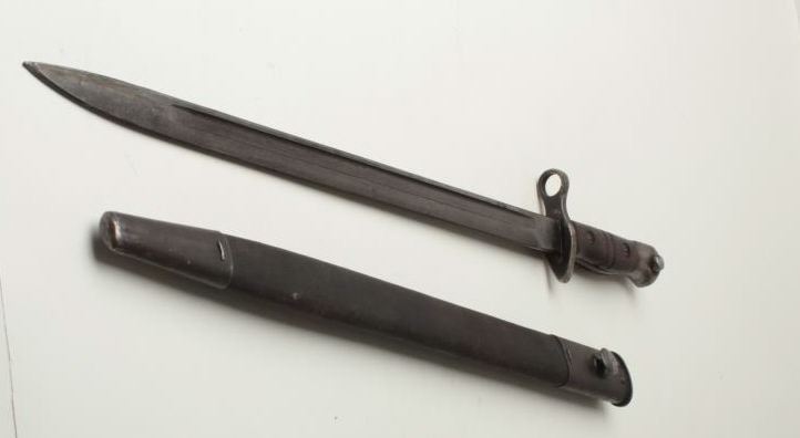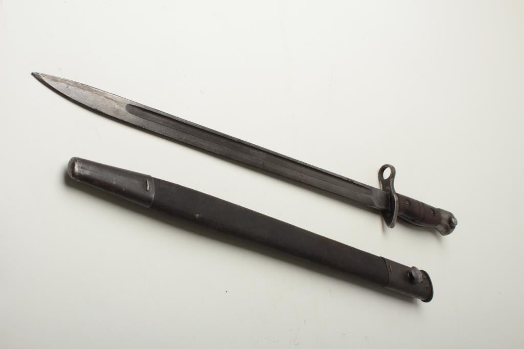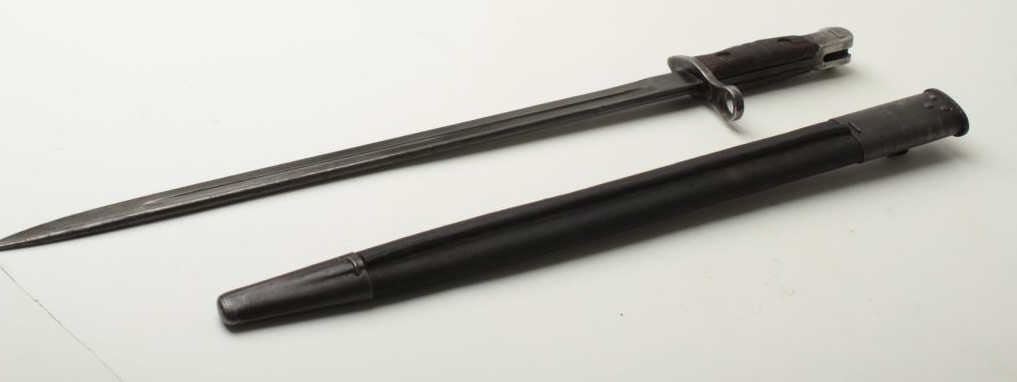 U.S. Remington bayonet for British Pattern 14 rifle, the bayonet features a 16 13/16” blade and overall length of 22 ¾”. The bayonet is in good overall condition showing use but retaining the majority of its military finish. The bladefeatures numerous British proofs including a short arrow over the crown. The ricasso is stamped with “1913” over “10 16”with the Remington circle logo. The stitched leather scabbard has a throat with a frog button. The reverse of the throat isstamped, “WUH”. Est.: $75-$150.