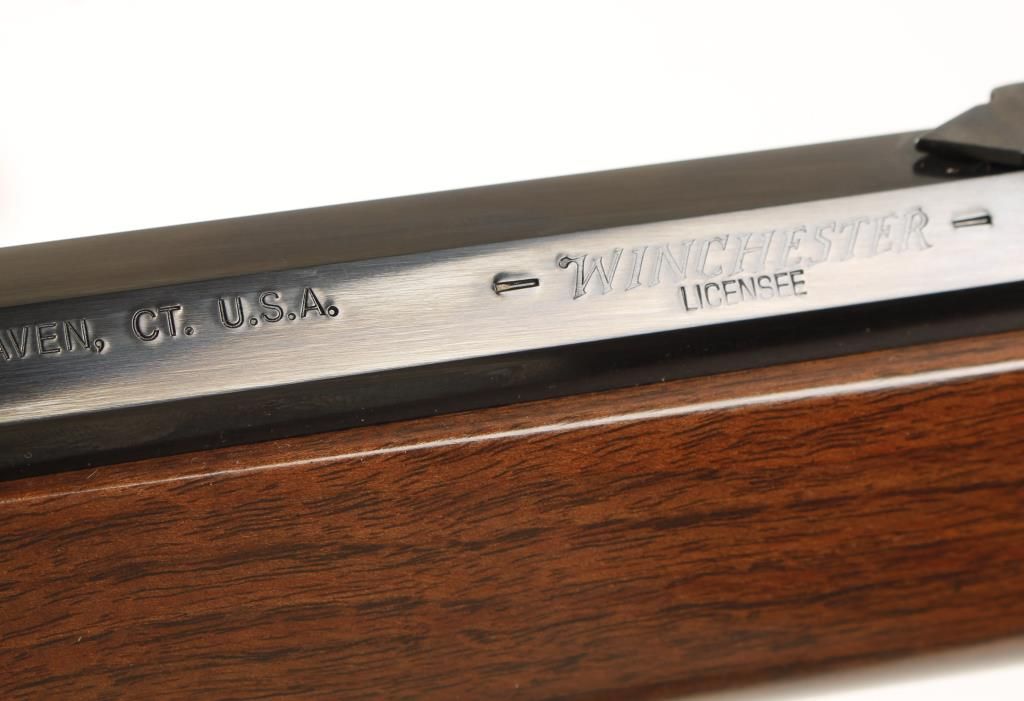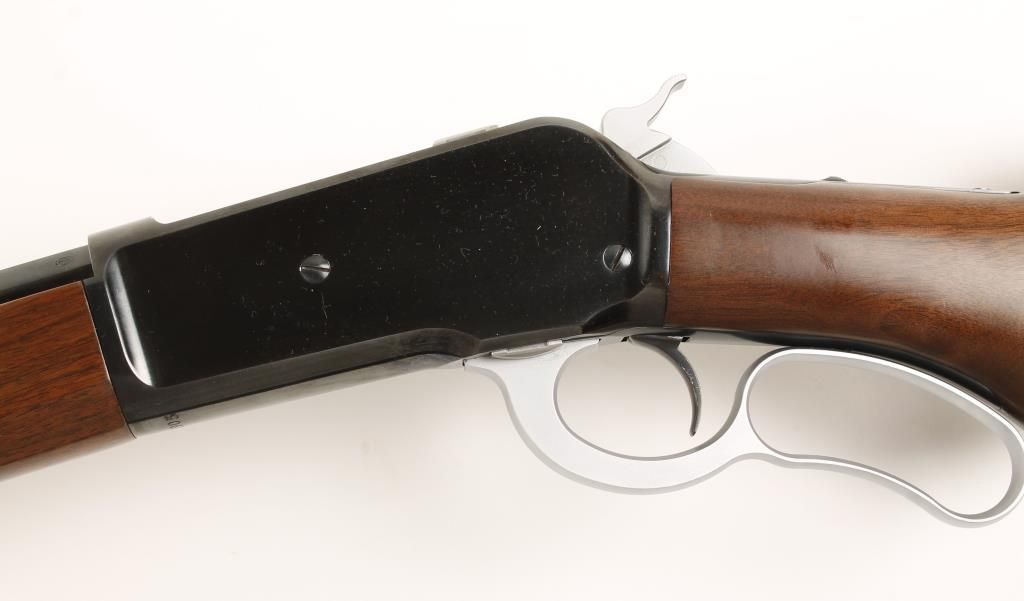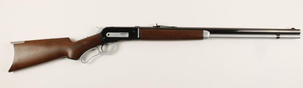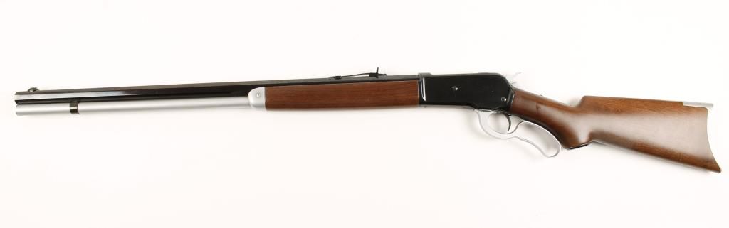 Modern Japanese made copy of the Winchester 1886. Made under license from Winchester. Extensively customized by gunsmith Lou Uhrudta (B&B Sales). Hammer, spring cover, butt plate, lever, extractor, magazine tube, and forend cap have all been hard chromed in a matte finish. 26" octagonal barrel with immaculate bore. Walnut pistol grip buttstock and forend. Condition is excellent. *Modern Firearm*