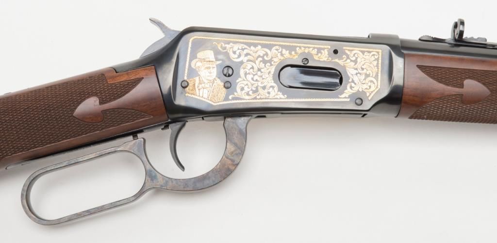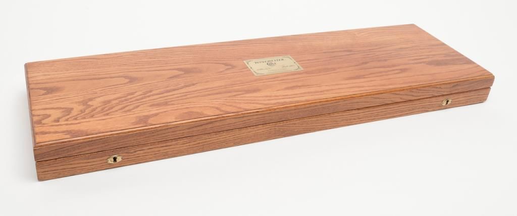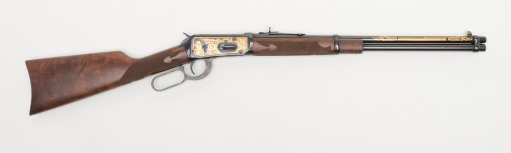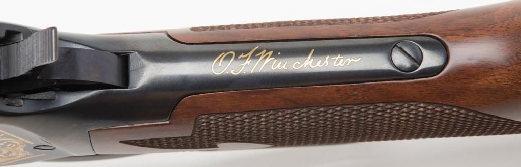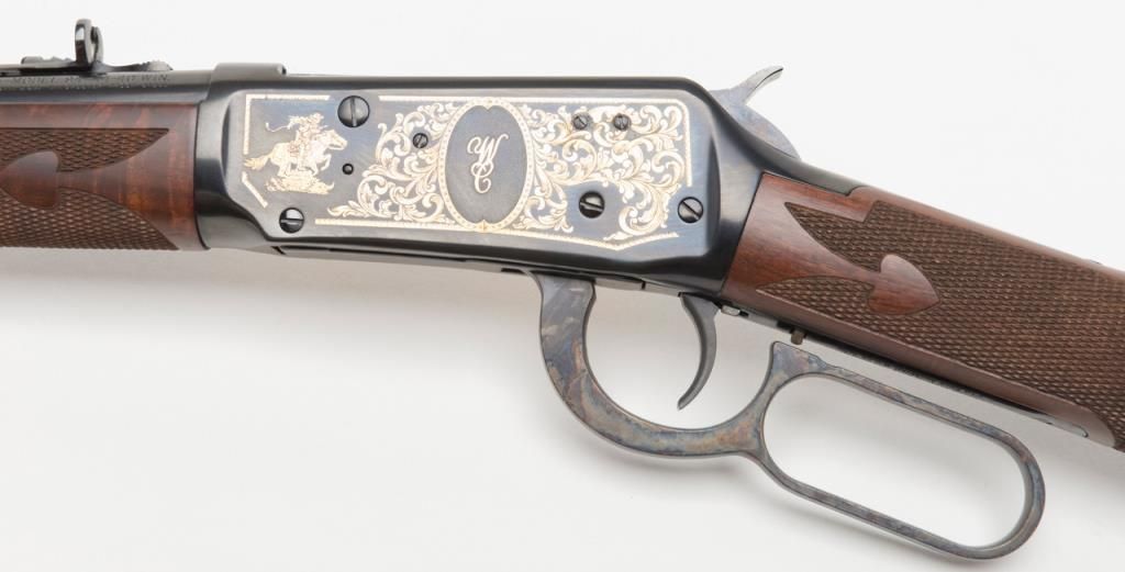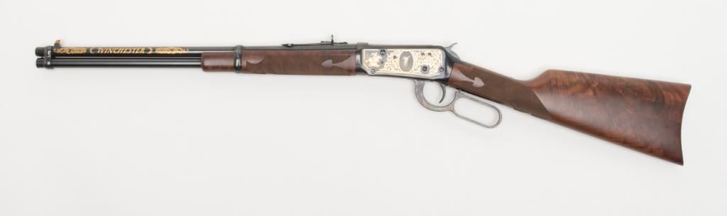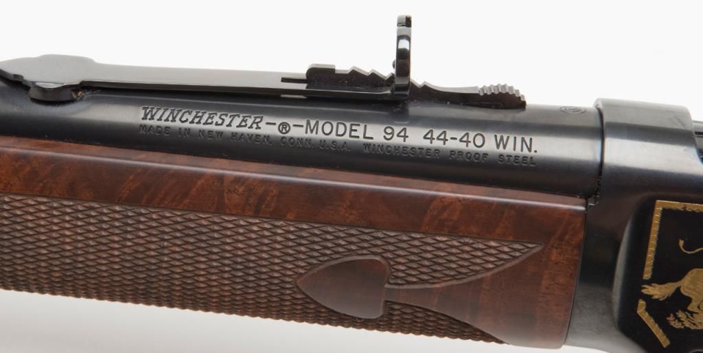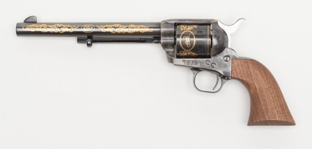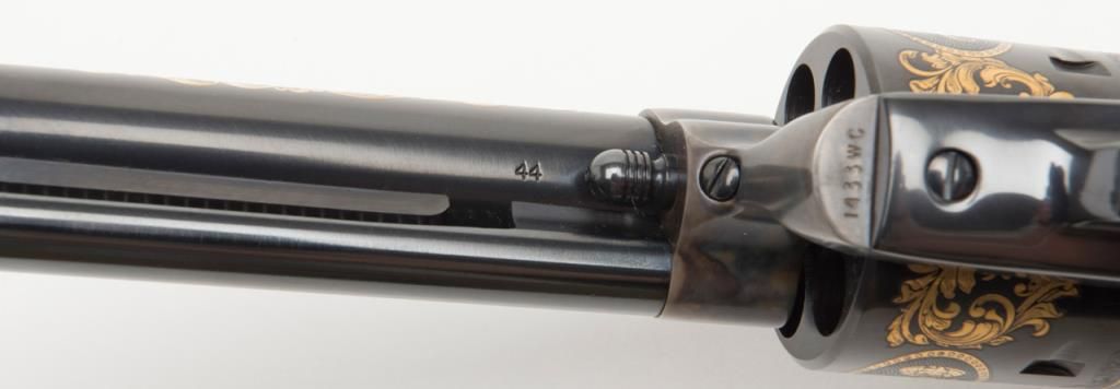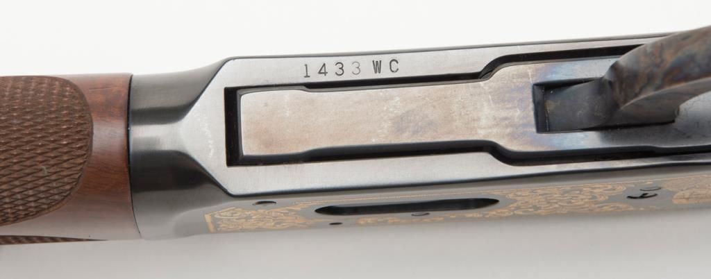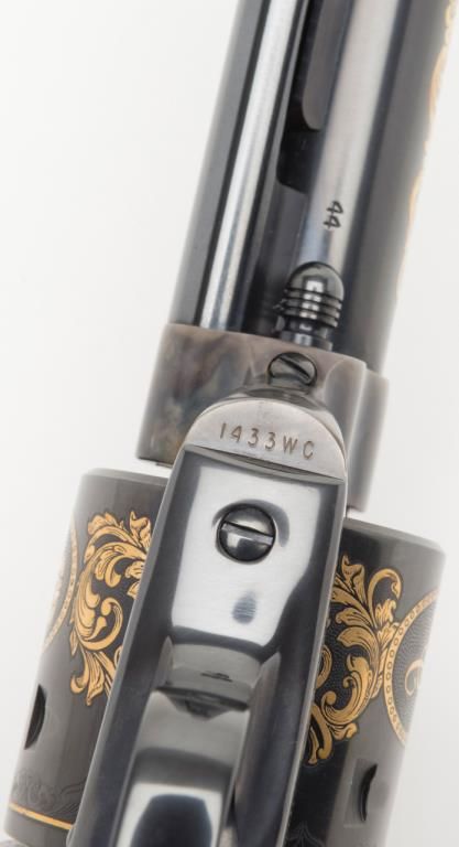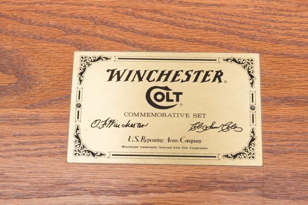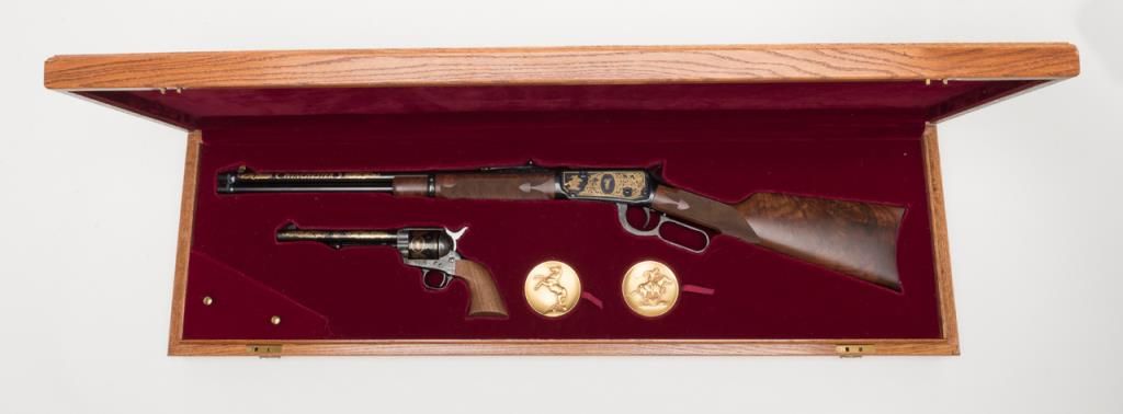 U.S. Repeating Arms Co. Winchester/Colt Commemorative Set consisting of a Winchester Model 94 lever action carbine, .44-40 Win. cal., 20” barrel, blue finish with commemorative gold colored ornamentation, checkered deluxe woodstocks, #1433 WC in like new condition and a Colt SAA revolver, .44-40 cal., 7-1/2” barrel, blue and case hardened finish, with matching commemorative gold colored ornamentation, smooth wood grips, #1433WC also in like new condition, both contained in a fitted maroon lined oak presentation wood casing with brass plaque in center of lid. Est.: $1,500-$3,000.