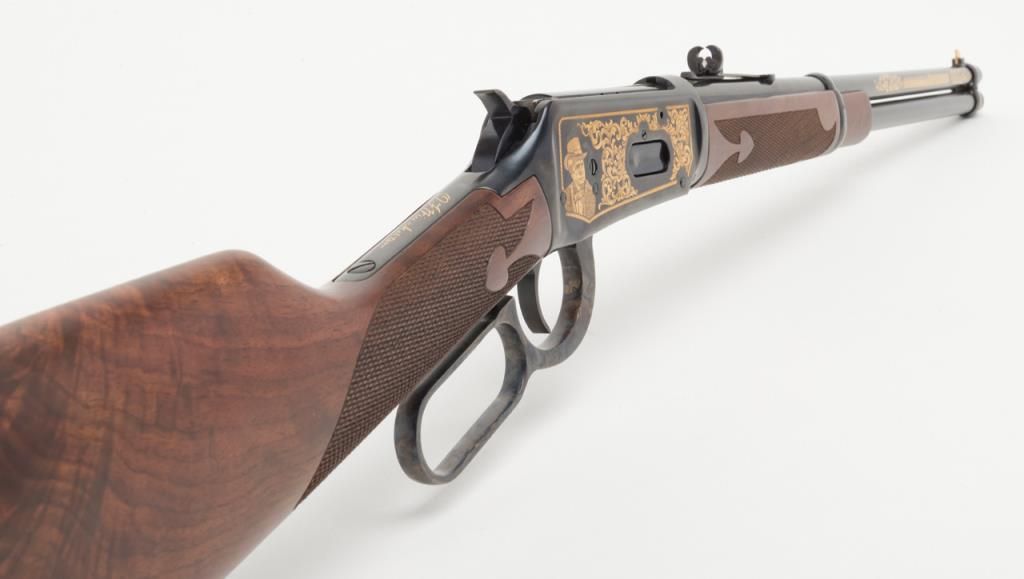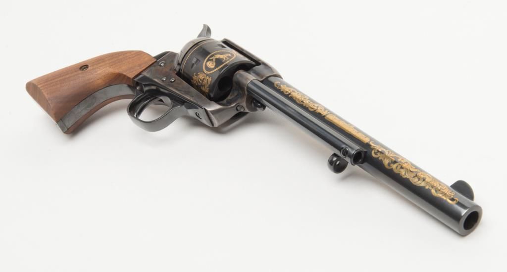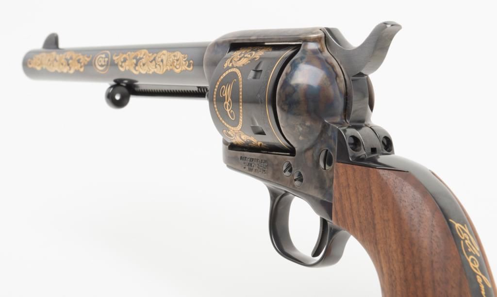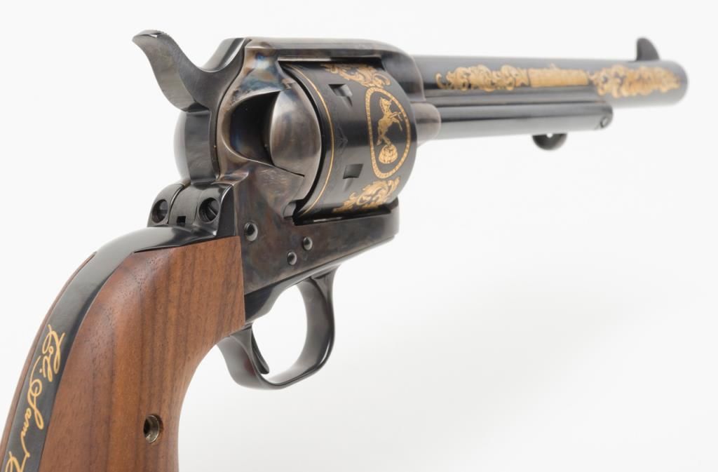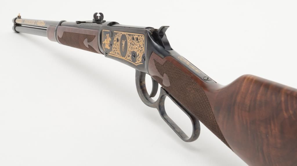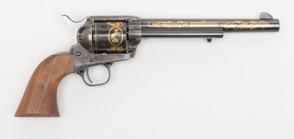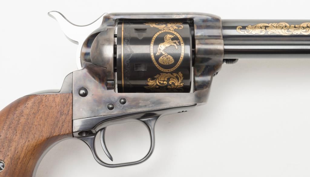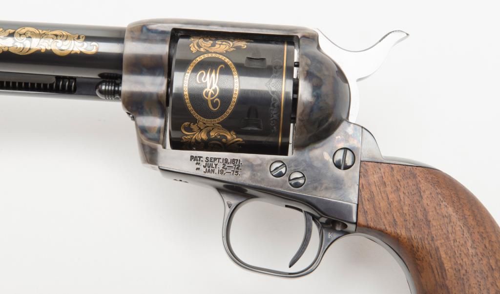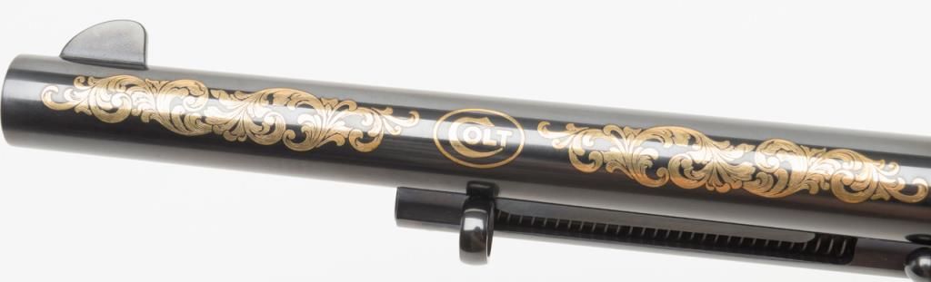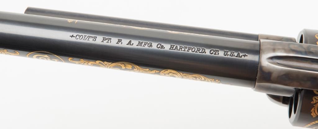 U.S. Repeating Arms Co. Winchester/Colt Commemorative Set consisting of a Winchester Model 94 lever action carbine, .44-40 Win. cal., 20” barrel, blue finish with commemorative gold colored ornamentation, checkered deluxe woodstocks, #1433 WC in like new condition and a Colt SAA revolver, .44-40 cal., 7-1/2” barrel, blue and case hardened finish, with matching commemorative gold colored ornamentation, smooth wood grips, #1433WC also in like new condition, both contained in a fitted maroon lined oak presentation wood casing with brass plaque in center of lid. Est.: $1,500-$3,000.