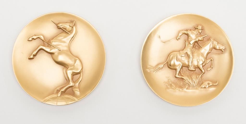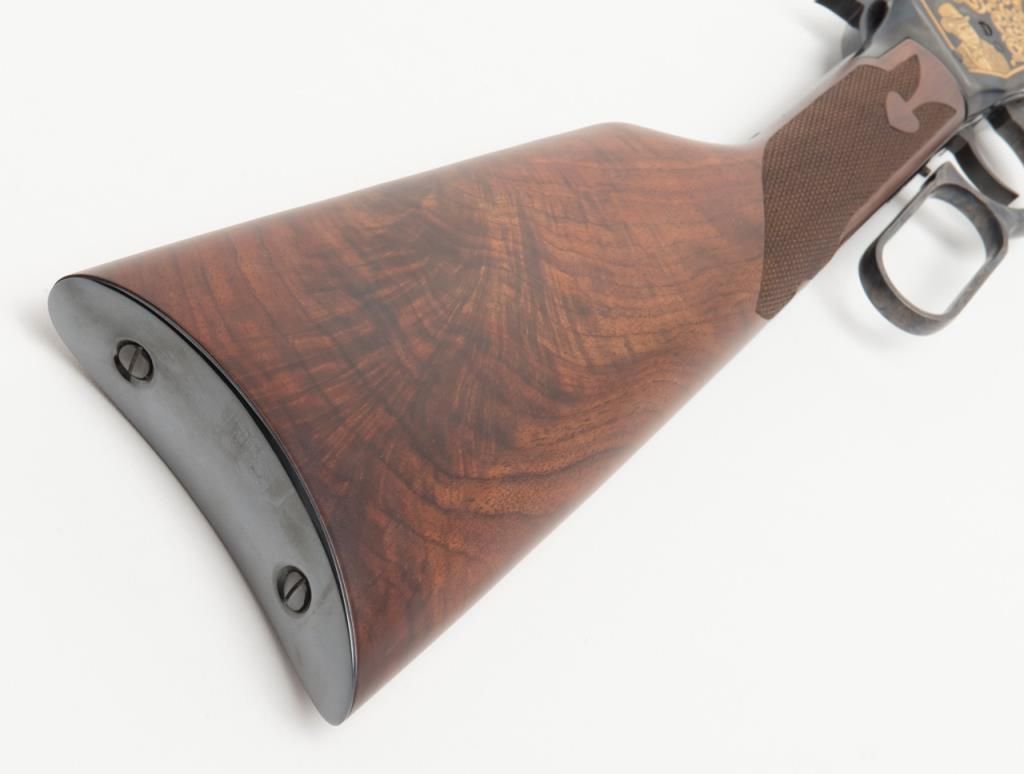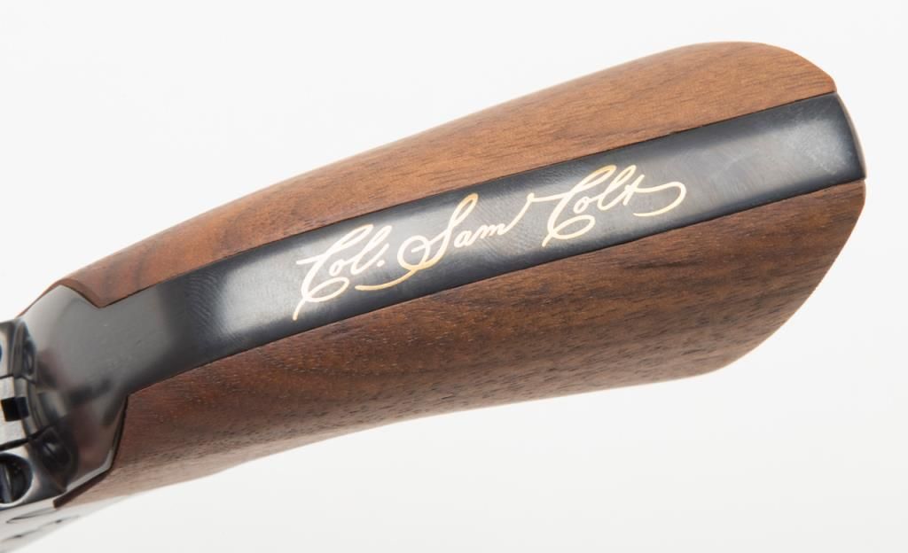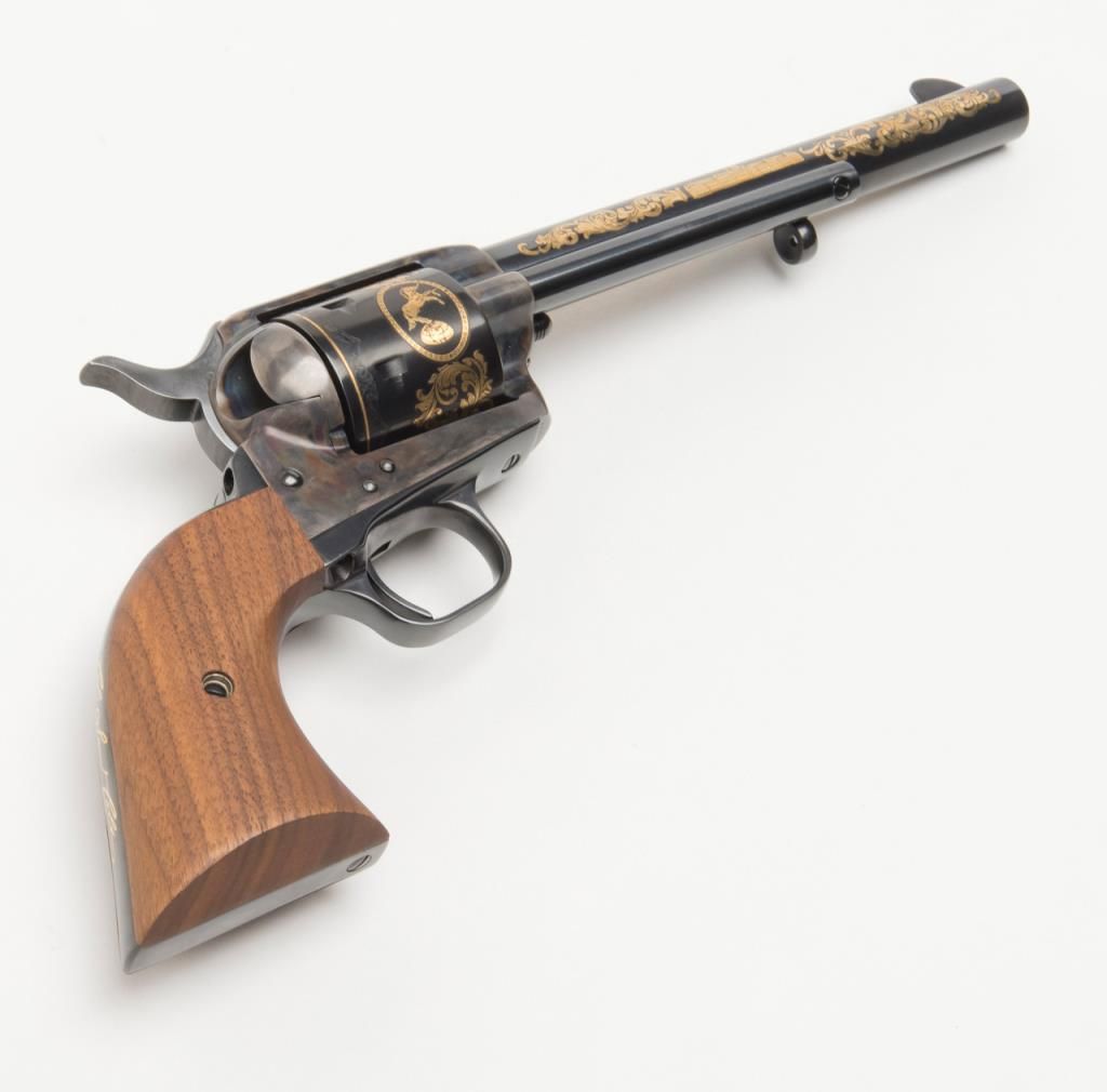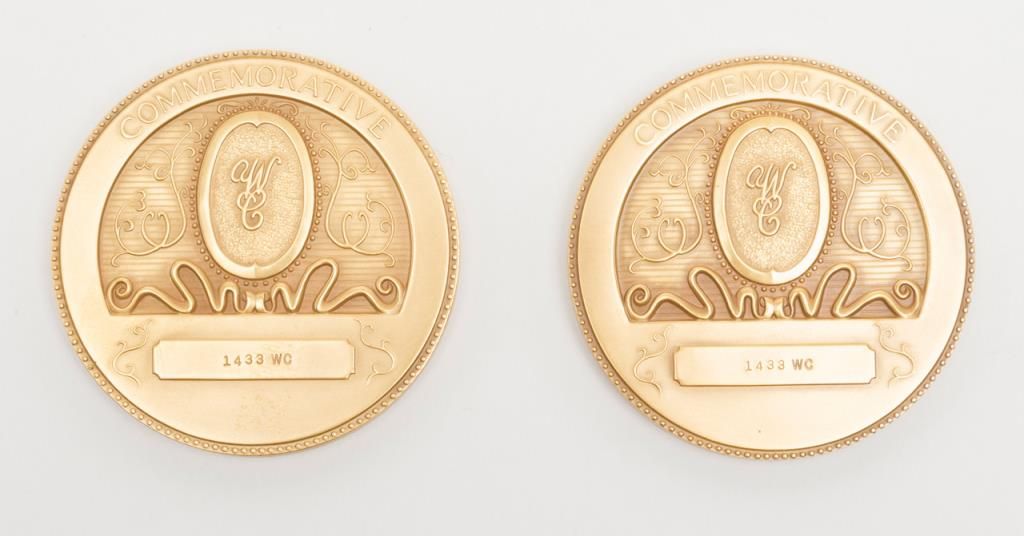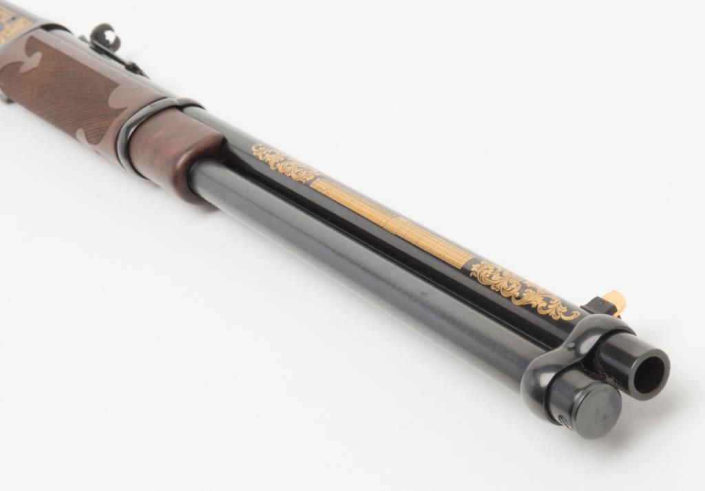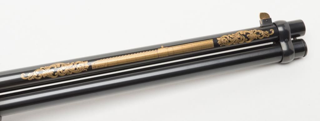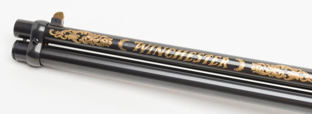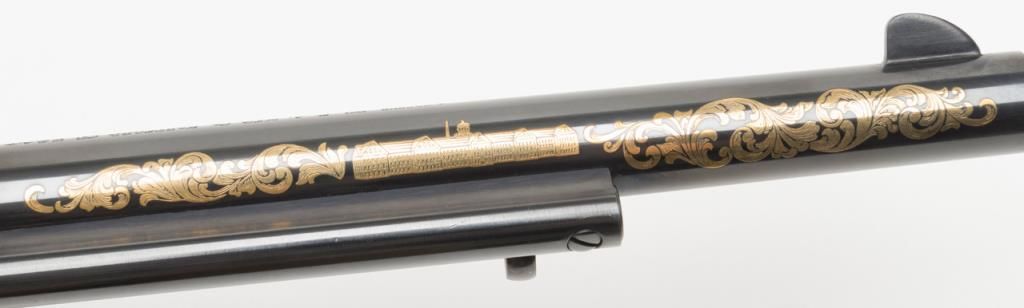U.S. Repeating Arms Co. Winchester/Colt Commemorative Set consisting of a Winchester Model 94 lever action carbine, .44-40 Win. cal., 20” barrel, blue finish with commemorative gold colored ornamentation, checkered deluxe woodstocks, #1433 WC in like new condition and a Colt SAA revolver, .44-40 cal., 7-1/2” barrel, blue and case hardened finish, with matching commemorative gold colored ornamentation, smooth wood grips, #1433WC also in like new condition, both contained in a fitted maroon lined oak presentation wood casing with brass plaque in center of lid. Est.: $1,500-$3,000.