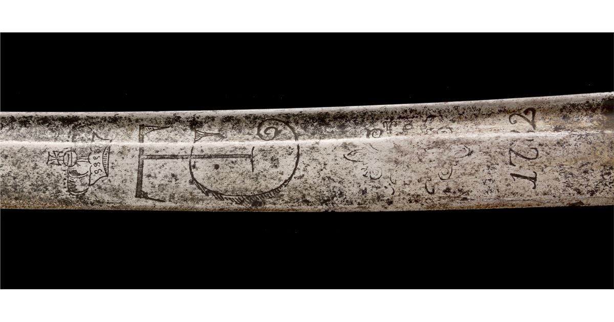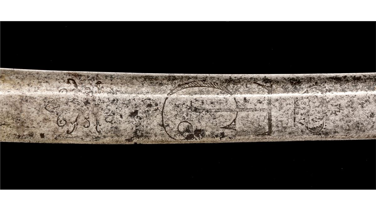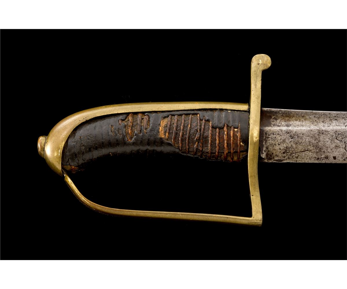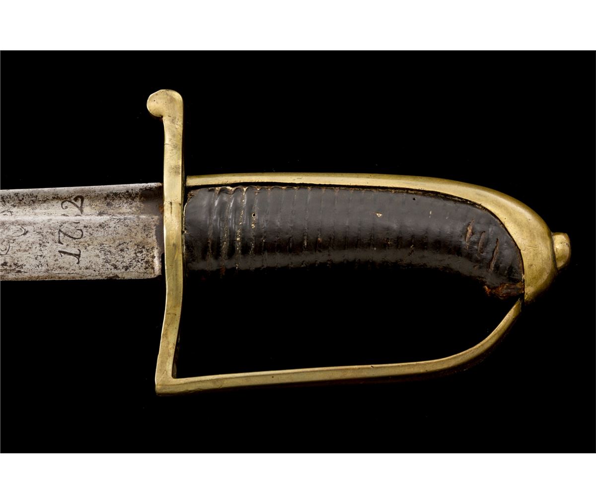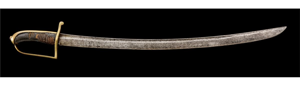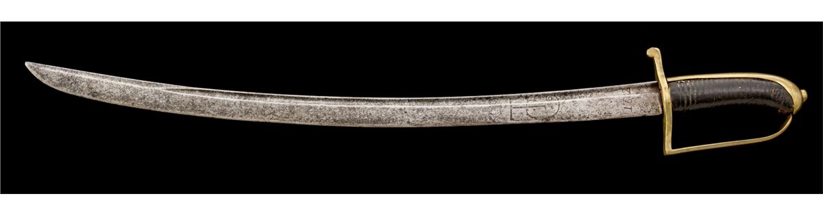 U.S. Revolutionary War Period Non-Commissioned Officer's Militia Sword, 23'' single fuller marked blade, 28-1/2'' overall, with leather wrap wood grip and simple brass crossguard and pommel. Blade marked ''(crown)/TC'', with fleur d'lis above the date 1782. Condition is very good to near fine. Blade with moderate carbon spotting. Markings are clear to both sides. Grip with losses to leather on reverse side. Scarce and seldom seen. Est.: $600-$800.