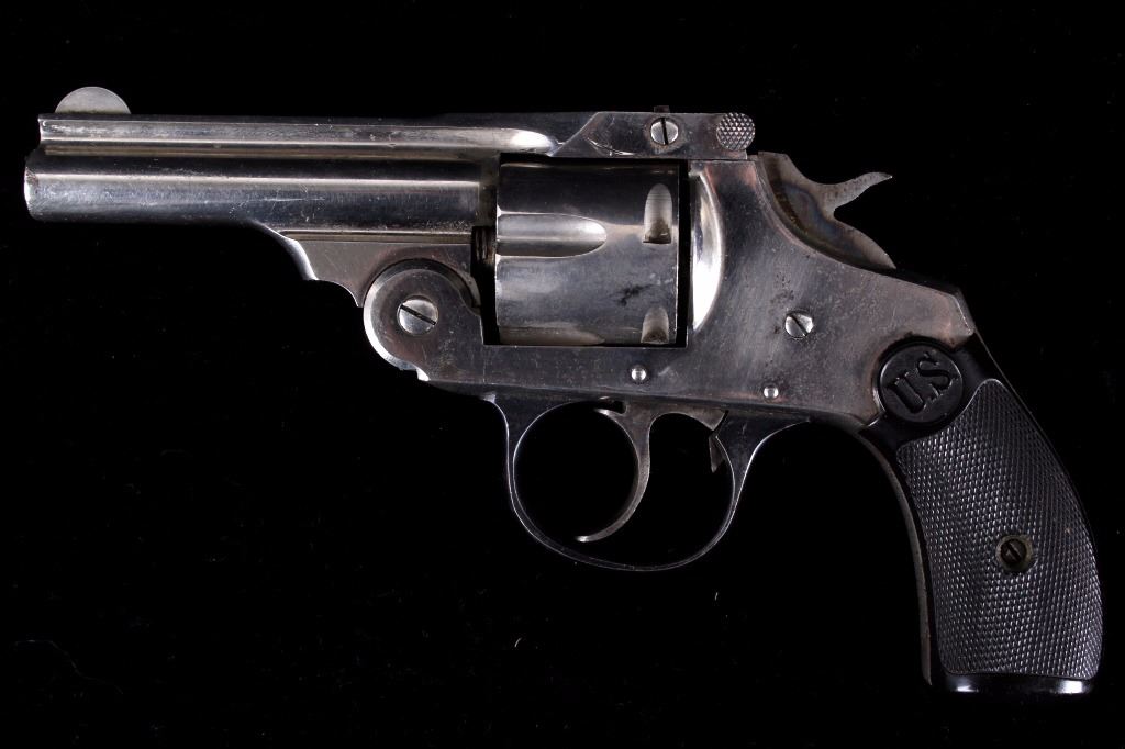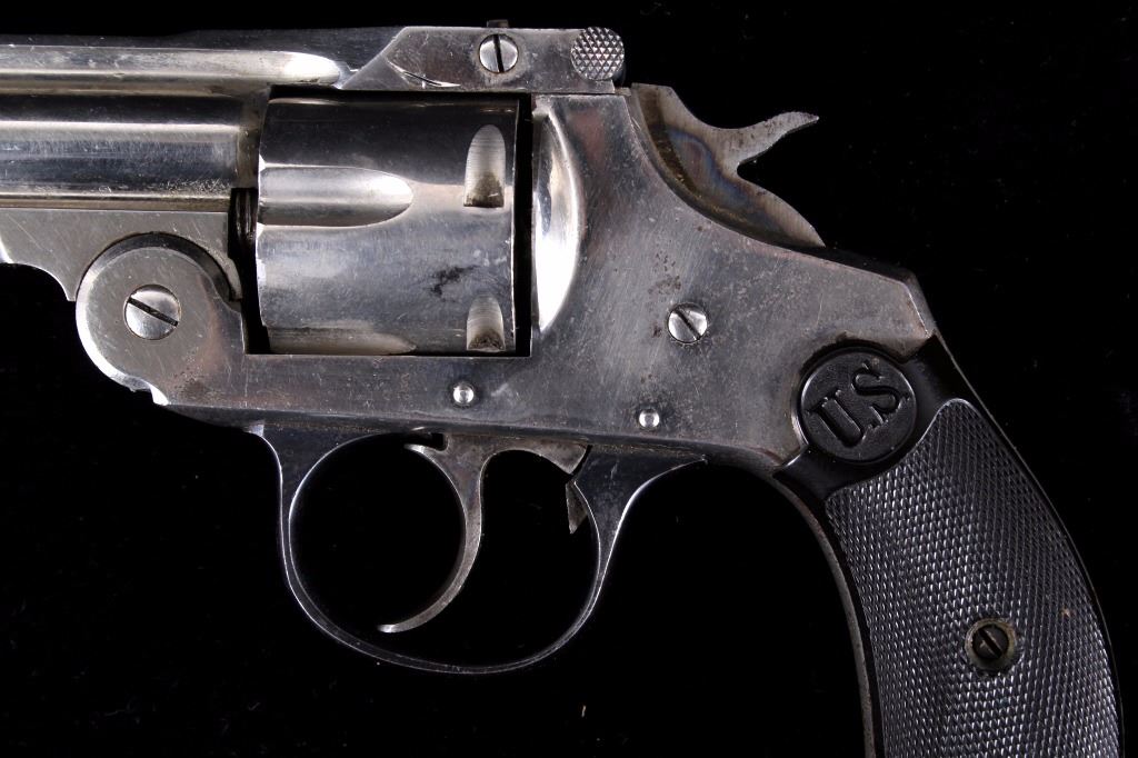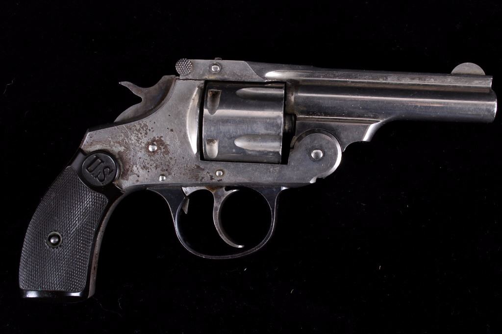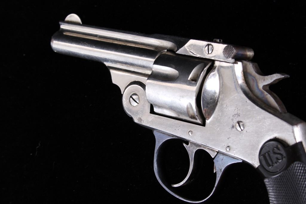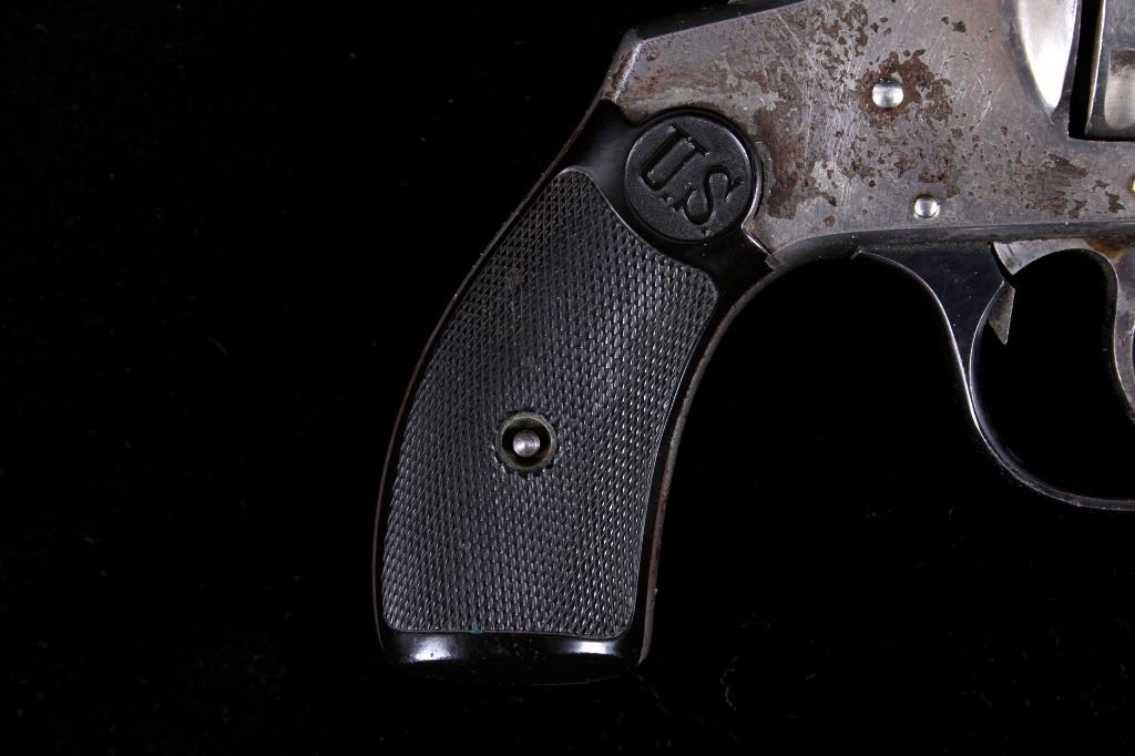 This is a U.S. Revolver Co. Iver Johnson double action top break revolver in a 38 caliber. The revolver shows a nickel finish with original hard rubber grips showing the "U.S." mark. The pistol also has a 3 1/4 inch solid rib barrel. Serial number 680 manufactured in 1910. The revolver is marked "U.S. Revolver Co. Made in USA." The revolver is in good condition, with wear around the handle and muzzle. Curio & Relic FFL Transfer or NICS Background required.