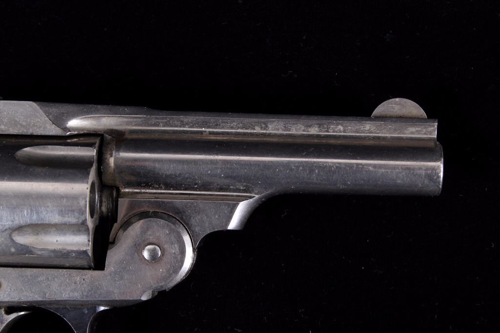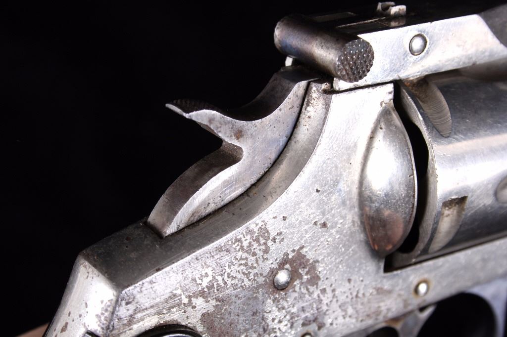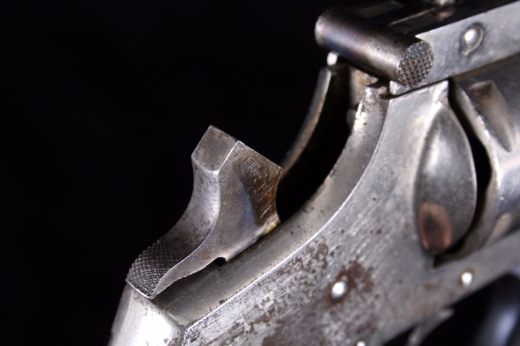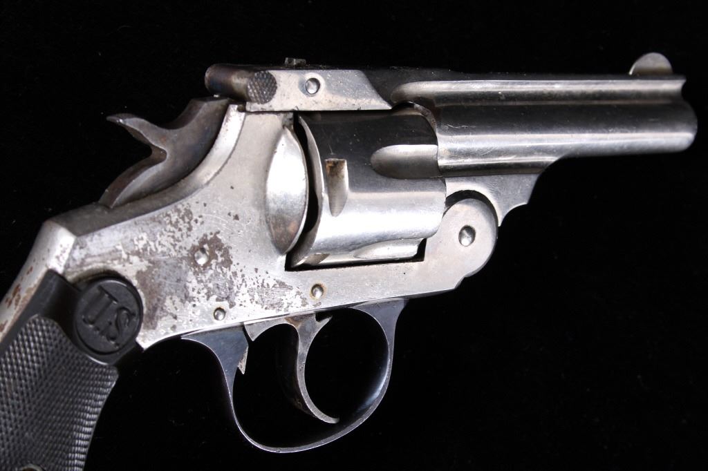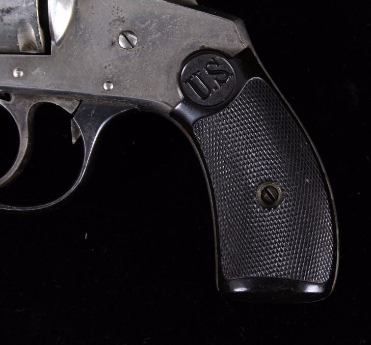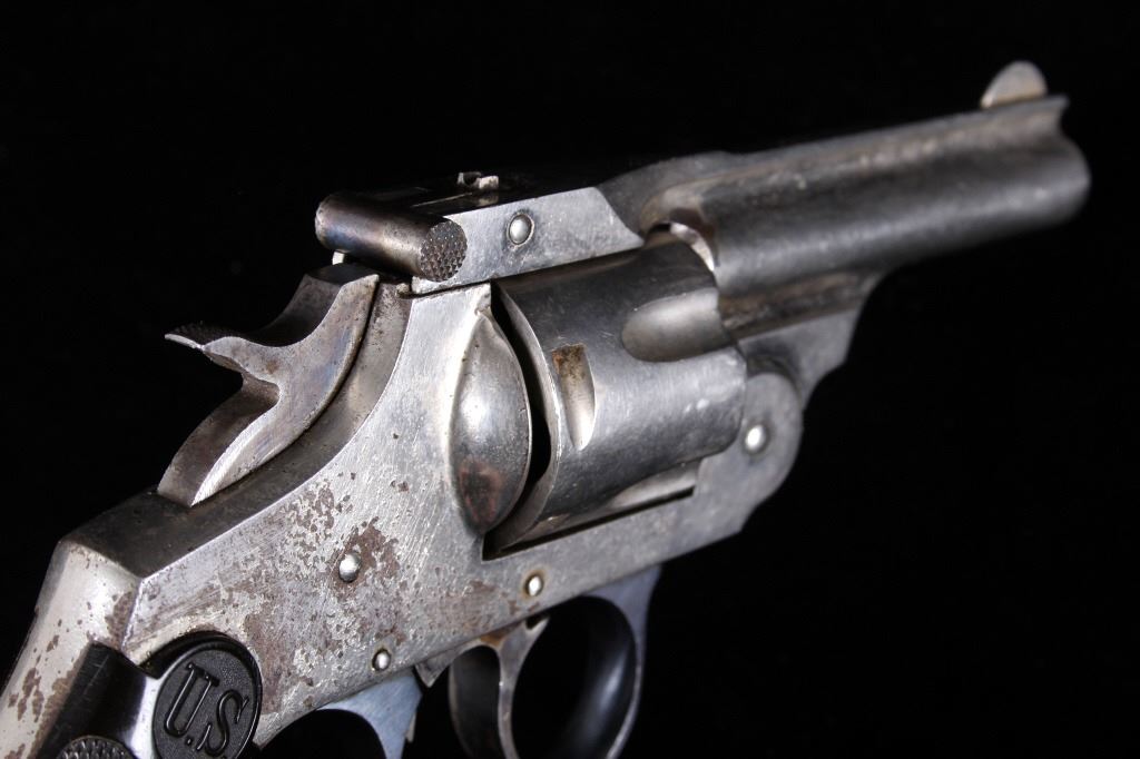 This is a U.S. Revolver Co. Iver Johnson double action top break revolver in a 38 caliber. The revolver shows a nickel finish with original hard rubber grips showing the "U.S." mark. The pistol also has a 3 1/4 inch solid rib barrel. Serial number 680 manufactured in 1910. The revolver is marked "U.S. Revolver Co. Made in USA." The revolver is in good condition, with wear around the handle and muzzle. Curio & Relic FFL Transfer or NICS Background required.