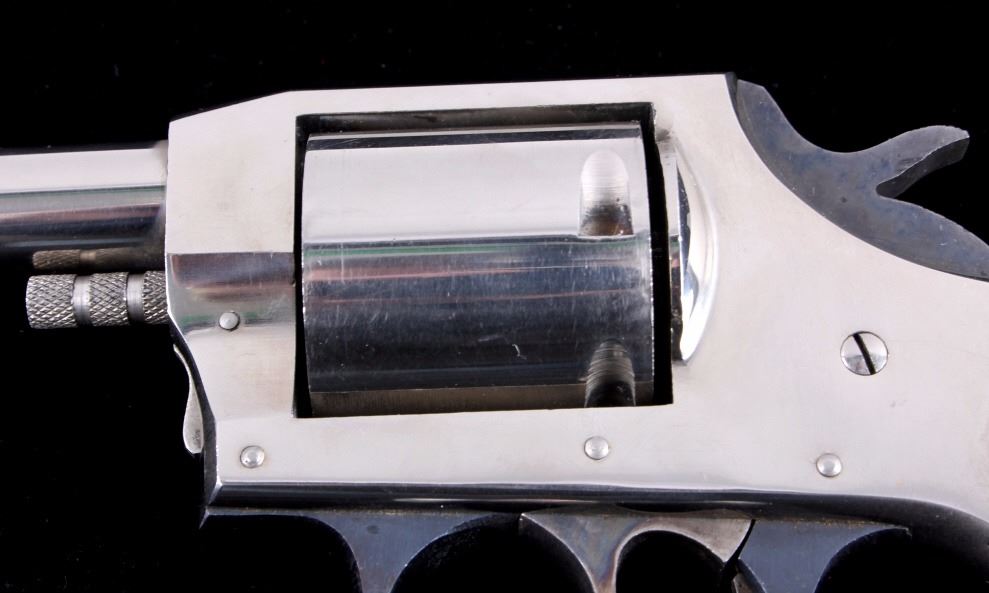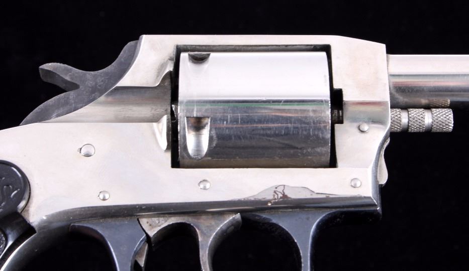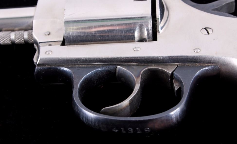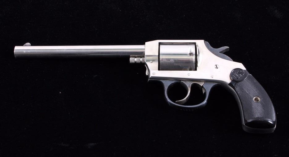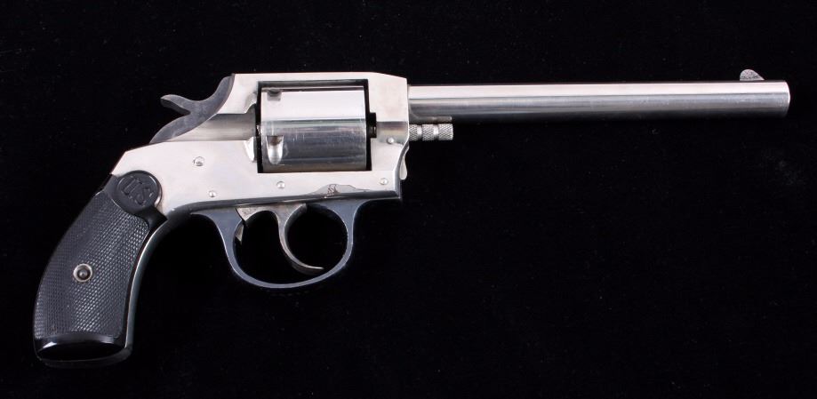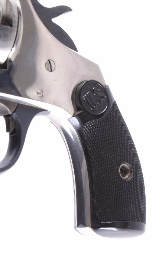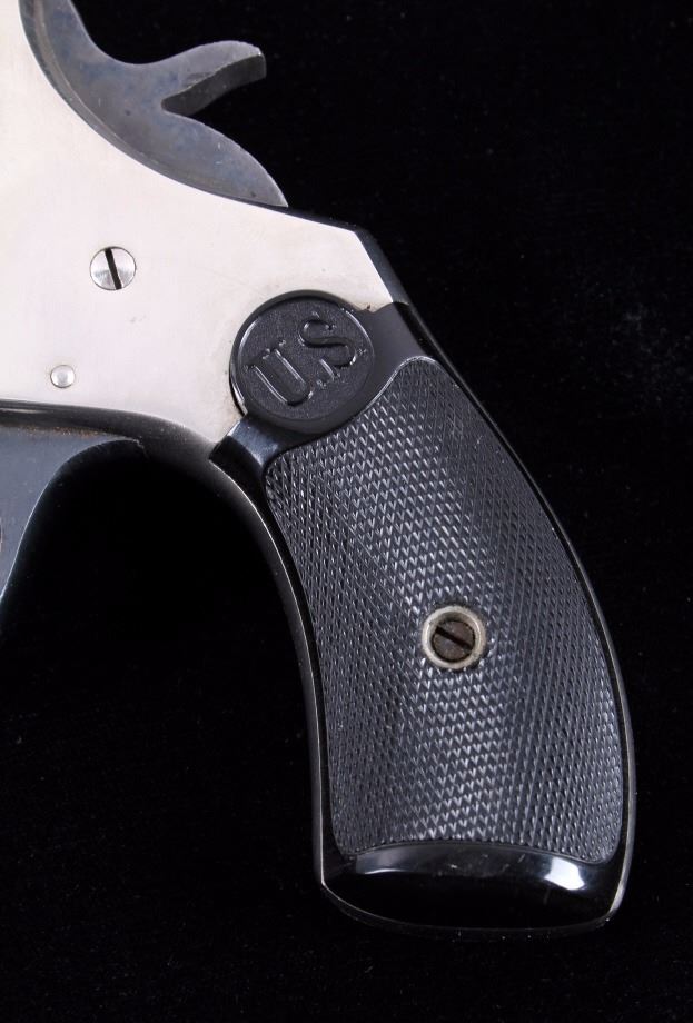 This is an Iver Johnson Arms Inc. "U.S. Revolver Co." double action top break revolver. The revolver shows a 38 S&W caliber with a 5 7/8 inch round barrel and nickel finish. The pistol also shows a blue finish on the trigger, trigger guard, and hammer. The pistol shows the hard rubber original grips with, "U.S." markings. The top of the frame is marked "U.S. Revolver Co. Made in U.S.A.". The handgun was manufactured circa 1910 to 1935 (most likely c. 1910-1920) and shows a serial number of 41319. Curio & Relic Handgun FFL Transfer or NICS Background required. Good overall condition.