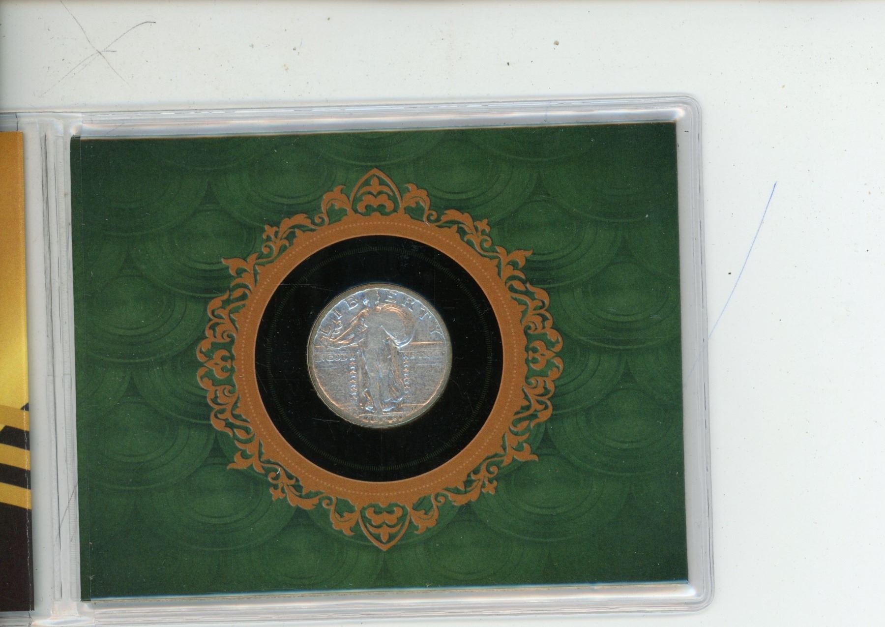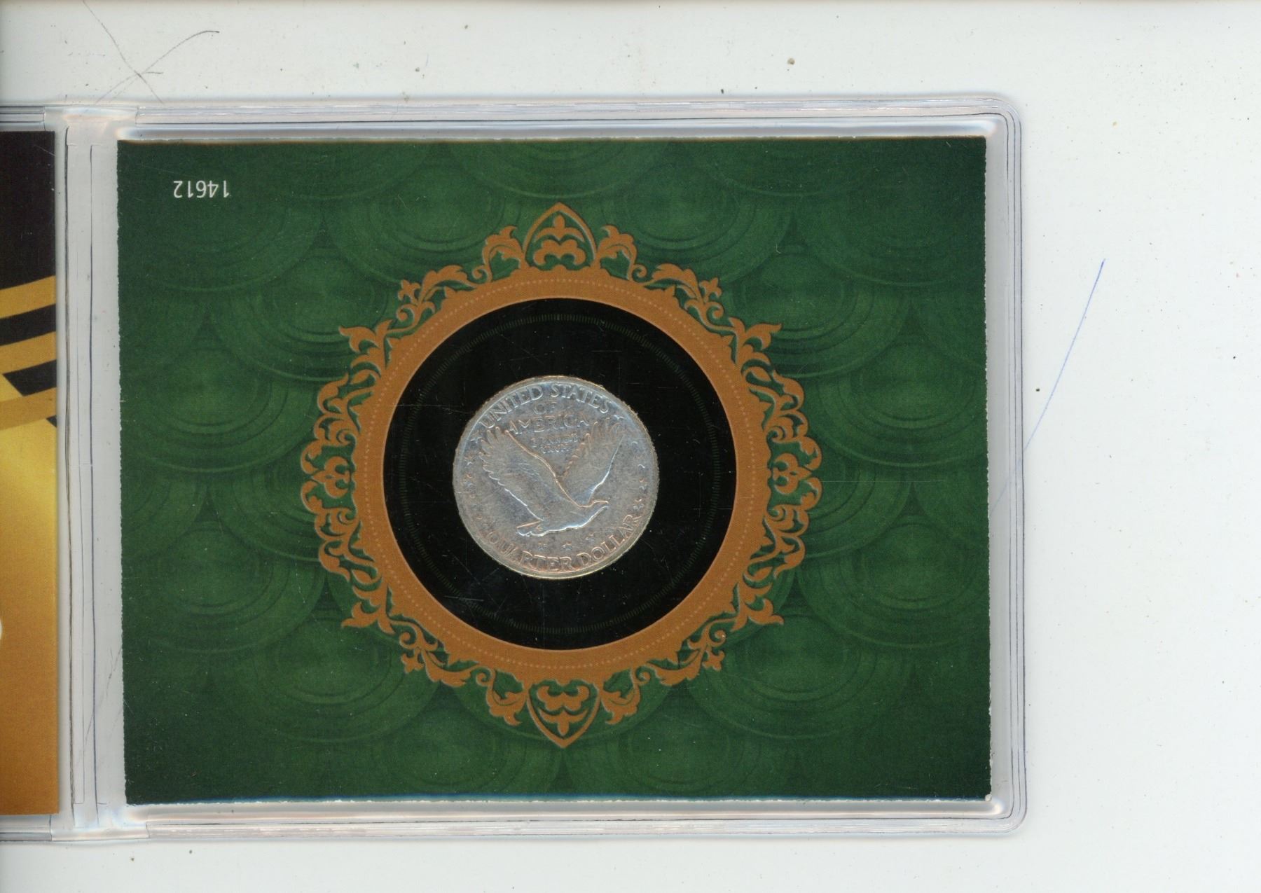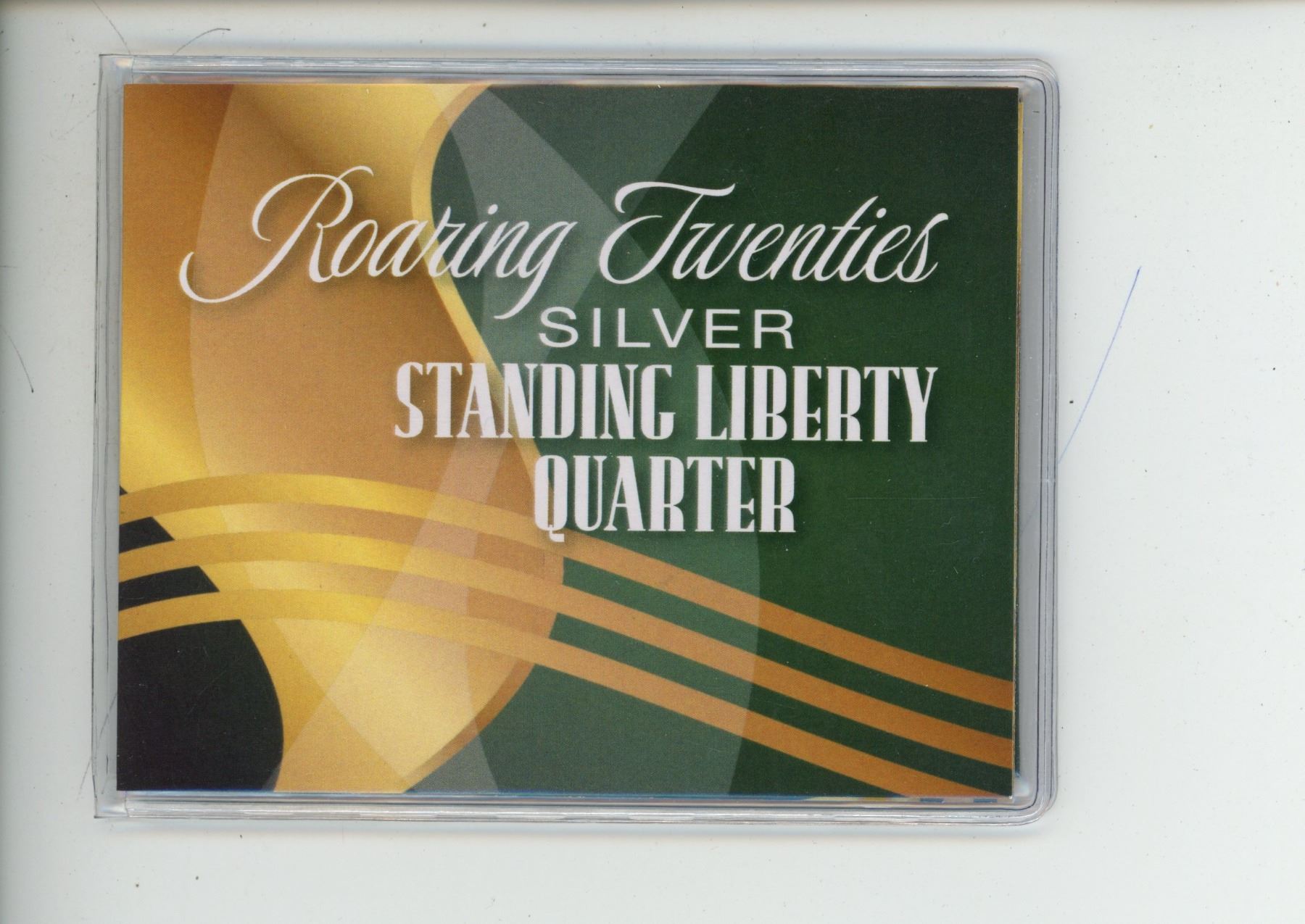U.S. Roaring Twenties Silver Standing Liberty Quarter. Coin is dated 1929, the first year of the Great Depression. Housed in a plastic holder.