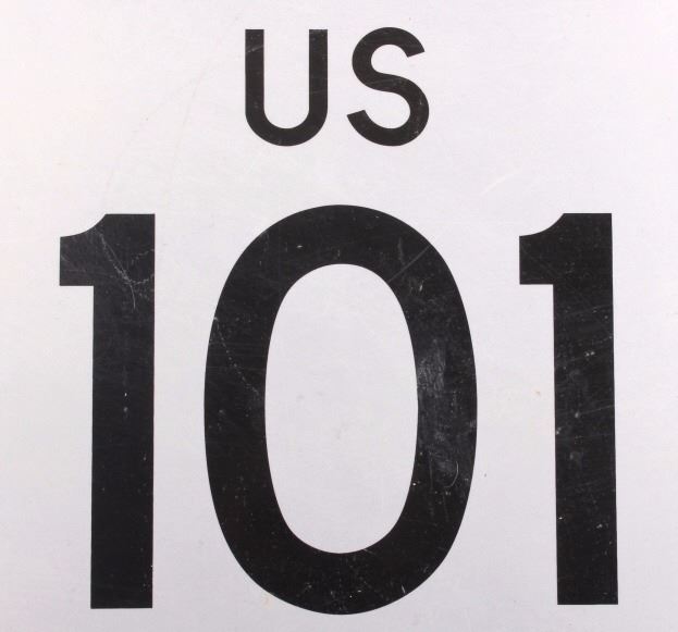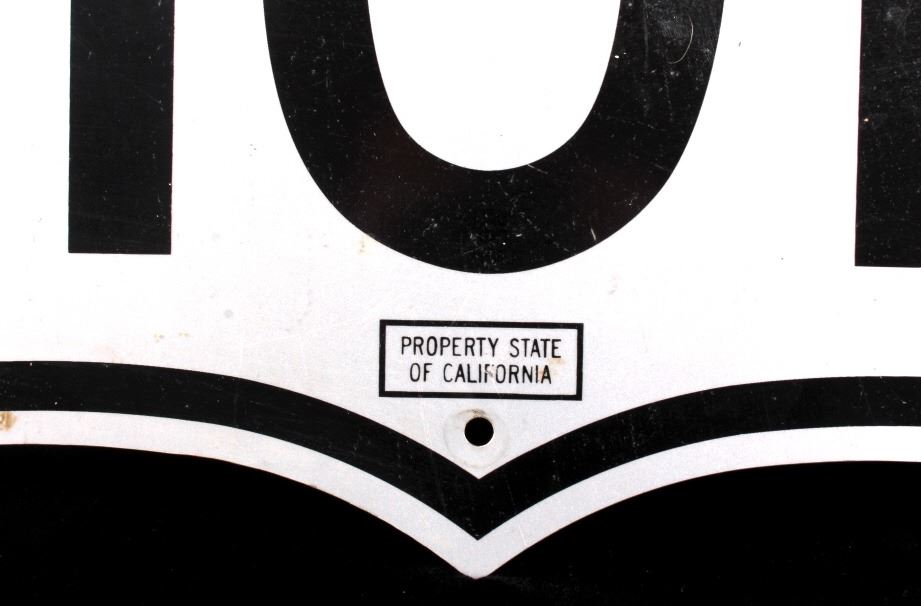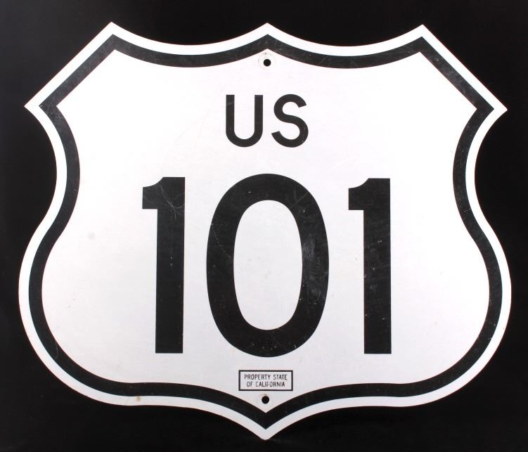 This is an original U.S. Route 101 sign from California. The sign shows a shield and reads "US 101". The sign is also marked "Property State of California". The highway sign is made from aluminum and shows good overall condition with minimal wear. The sign measures 20" x 23.75".