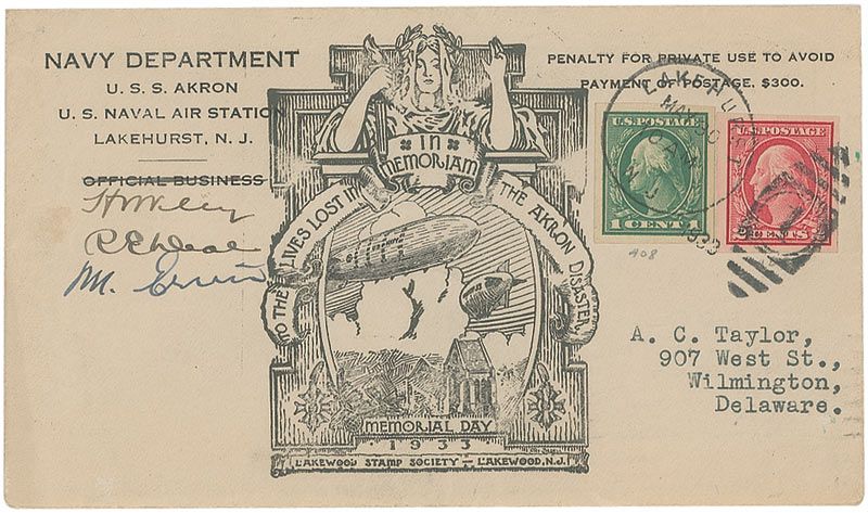 Accident-prone naval airship that was lost in a weather-related accident on April 4, 1933, killing 73 of the 76 crew and passengers on board. Commemorative Navy Department penalty cover honoring the loss of the Akron, postmarked 1933 on the reverse, signed in ink by the ship’s only three survivors, Herbert V. Wiley, Richard E. Deal, and Moody E. Erwin. A light, uniform block of toning from previous display, light creasing, and a typed address, otherwise fine condition. Accompanied by a TLS of provenance from Deal, dated May 30, 1933.