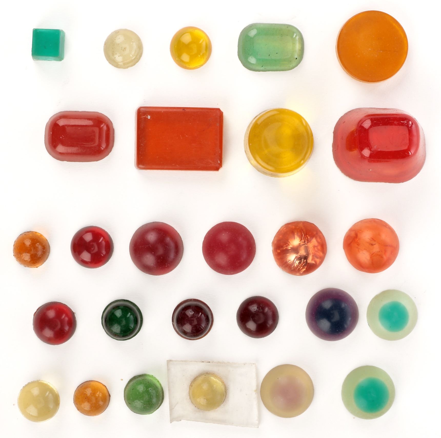 370. U.S.S. Enterprise (26) control panel buttons from the bridge from the collection of visual effects supervisor James Rugg from Star Trek: The Original Series.(Paramount TV, 1966-1969) Vintage original collection of (26) multicolor cast resin jewel "buttons" used on the control panels on the bridge of the Enterprise. Ranging from approx. .5 x .5 in. to 1.5 x 1.25 x .75 in. The buttons are highly visible in insert shots when buttons are pushed on the bridge technology in the show. Acquired from special effects artist Jim Rugg. Exhibiting minor production wear and remnants of adhesive on the back. In vintage very good to fine condition. $800 - $1,200