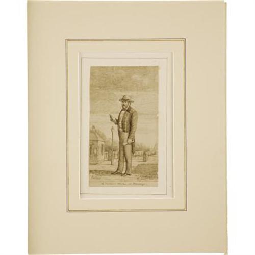 <B>U.S.S. </B></I><B><I>KEARSARGE</B></I></B></I><B> CAPTAIN JOHN A. WINSLOW INK DRAWING FROM LIFE</B></I>. “<I>Le Capitaine Winslow, du Kearsarge</B></I>”, 3.75” x 6.75” sight size, matted to 10.75” x 14” overall, signed “<I>Galland</B></I>” and inscribed “<I>Cherbourg 22 Julliet 1864</B></I>”. The victor of the historic <I>Alabama</B></I> vs. <I>Kearsarge</B></I> duel is shown in civilian clothing standing on a Cherbourg street near the docks. Winslow holds a rolled document and appears to be expounding to a listener. <BR><BR><B>Provenance:</B></I><I> Kennedy Galleries, New York; The Don Tharpe Collection of American Military History</B></I><BR><BR><B>Exhibited:</B></I><I> The Liberty Heritage Society Museum</B></I><BR><BR><B>Condition: </B></I>In excellent condition and ready to frame. <BR><BR><b>Shipping:</b> Flat Material, Small (<a target="_blank" href="http://www.heritageauctions.com/common/shipping.php">view shipping information</a>)