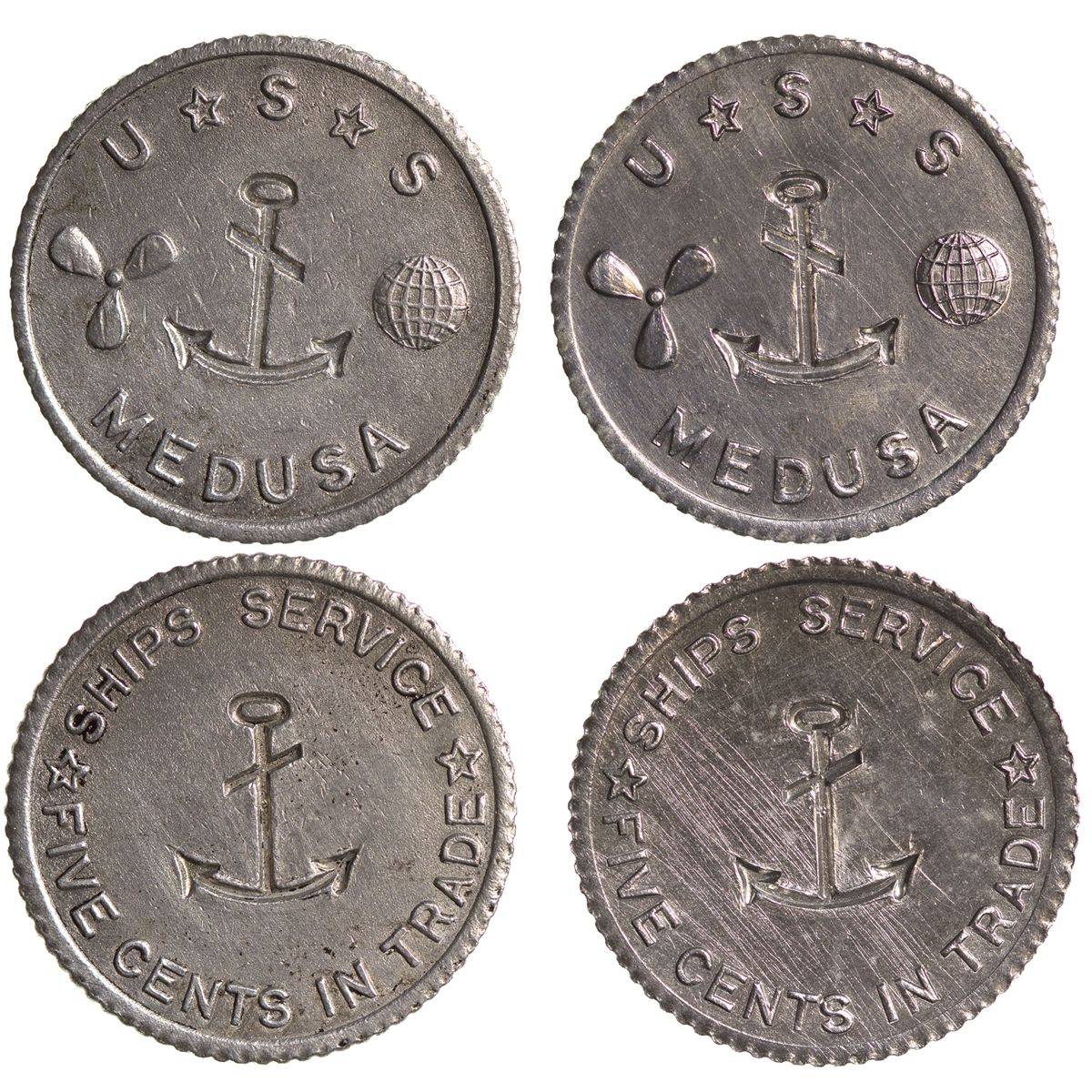 Lot of 2. 1) 23mm, aluminum, reeded edge. Curto 109-a. 2) 24mm, five cents ship service. - Weber Collection