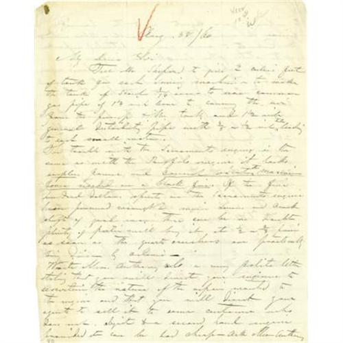 <B>U.S.S. </B></I><B><I>Monitor</B></I></B></I> <B>Inventor John Ericsson Autograph Letter Signed,</B></I> "<I>J. Ericsson</B></I>", two pages, 7.5" x 9.75", n.p., August 28, 1860, to unknown recipient (probably his agent, John Kitchen). A lengthy discourse on steamship engines with the following being a short excerpt: "<I>…The trouble with the Sacramento engine is the same as with the Buffalo engine, it lacks surplus power and cannot exert the maximum force needed on a black fire…</B></I>". Stains to left margin, some fading, with collector's penciled notations and a red check mark over date. The signature is huge and quite legible. Very good condition. <I>Ex. Henry E. Luhrs Collection.</B></I><BR><BR><BR><b>Shipping:</b> Flat Material, Small (<a target="_blank" href="http://www.heritageauctions.com/common/shipping.php">view shipping information</a>)