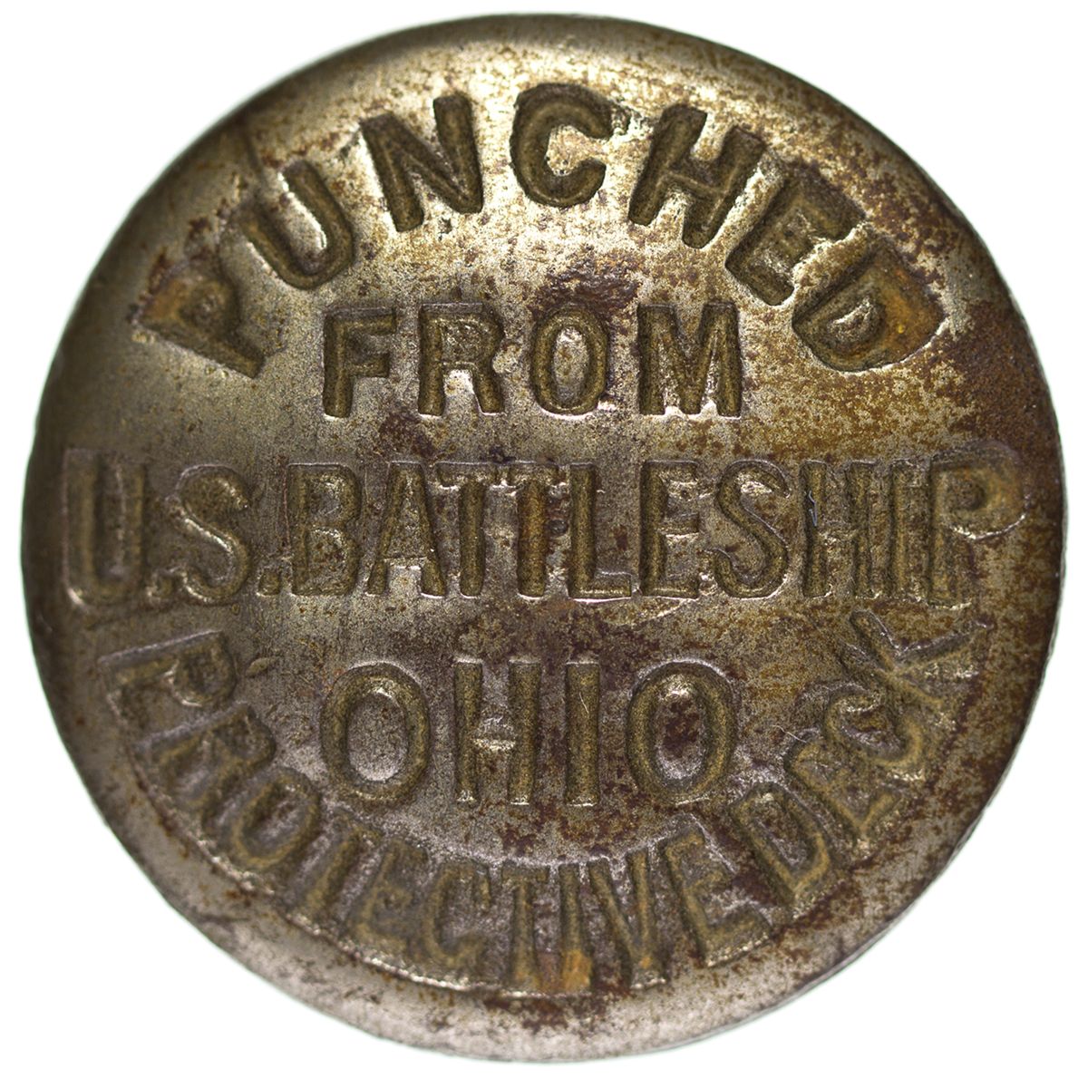3.35 oz. Metal plug, "punched from the U.S. Battleship Ohio protective deck." - Weber Collection