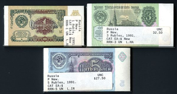 Russia, (3 packs of 100 each), Includes 1 Ruble, P-237a; 3 Rubles, P-238a; 5 Rubles, P-239a, all are Choice to Gem Uncirculated.