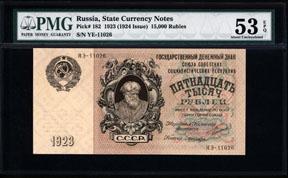 1923 (1924) Issue. 15,000 Rubles, P-182, Brown on m/c with portrait of man in middle, The fifth of 6 different signature varieties being offered in this auction of the 10 that are known. PMG graded "53 About Uncirculated EPQ, Exceptional Paper Quality". The note appears Uncirculated to CU condition and would be a prize for any descriminating collector. Another scarce signature variety in high condition.