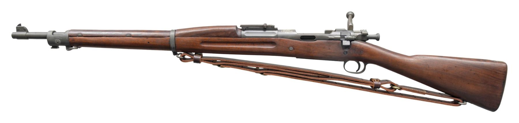 RIFLE. Cal. 30-06. S# 1160042. Markings are enhanced in white. Bbl. 24". Marked behind front sight "SA / flaming bomb / 1-19". This rifle was originally manufactured for the Pedersen Device, which was developed during WWI. The left receiver rail has an oval-cut to accommodate the ejection port of the Pedersen Device. The original magazine cutoff, which was used to secure the Pedersen Device in use has been retained. The trigger, which originally had a two-piece sear, has been modified to a single sear. Ladder rear sight graduated to 2,850 yards w/ volley notch. Blade front sight. Replacement Model 1903A3 bolt is marked "R" under the bolt handle, safety & shroud. The safety lug, interestingly, is the squared type favored by Smith Corona. All milled furniture except the butt swivel. Smooth trap buttplate. Replacement walnut stock set. Straight grip stock has been modified by the addition of grasping grooves & the relief cut on the left side to accommodate the ejection port. Stock is marked "K" in cutoff recess indicating Keystone manufacture. Stock is marked on the left side w/ "RA-P" overhaul mark & faint encircled "P" proof under grip. Quality brown leather sling w/ brass hooks is marked "T.S.C.O.". CONDITION: stock set has nice appearing arsenal rework type finish w/ very light wear & small scattered handling marks. There is a slight loss of wood in inletted areas. Metal retains virtually all of its arsenal rework gray parkerized finish w/ only very light high point wear. Fair bore w/ frosted grooves & moderately worn lands. (25-3816/RW). CURIO. $400-600.