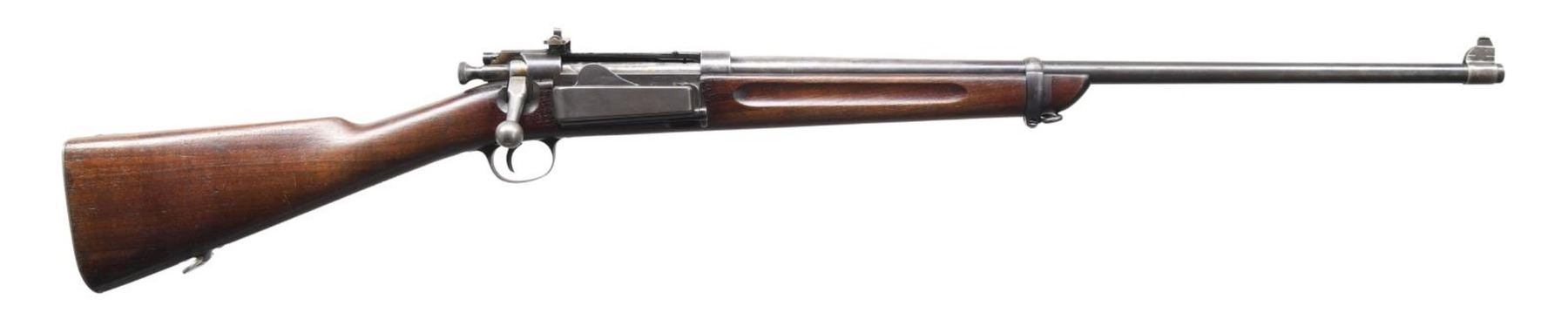 SPORTERIZED BOLT ACTION RIFLE. Cal. 30-40 Krag. S# 90845. Bbl. 24". Lyman No. 33K aperture rear sight installed on left side of action. Flip up auxiliary peep has been partially removed. Front sight is from a Model 1903 Springfield. The moveable base is equipped with a white bead sporting blade. The original rear sight has been removed and the screw holes filled. The walnut stock has been cut approximately 1 1/2" above the lower band. The stock has no visible acceptance marking but does have the circle "P" script proof. The finish appears to be original. Smooth trap buttplate. The original swivels have been retained. The metal has the appearance of an early professional refinish. CONDITION: stock set has moderate wear and handling marks throughout. There are 6 notable notches underneath grip. Metal is turning gray with patina, thinning and wear. Fair bore with lightly worn lands and frosted grooves. PROVANANCE: the Lifelong Collection of Terrence McCarty. (01-24675/RW). ANTIQUE. $300-500.