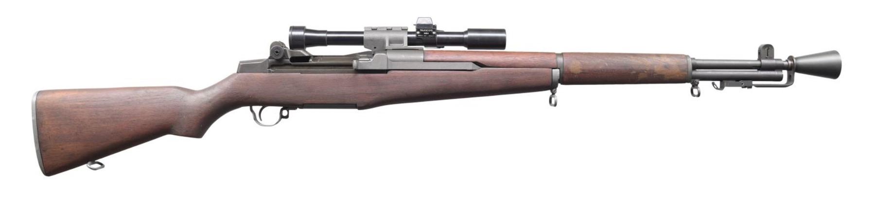 MILITARY SNIPER RIFLE WITH CMP PAPERS. Cal. 30-06. S# 3849449. Bbl. 24" marked on right side "S-A 8 52". Throat gauges 2.0. Muzzle gauges 1.0. T105E1 aperture rear sight. Blade front sight with protective ears. Top of sight blade has file marks. Original arsenal reworked M1D Sniper rifle with matching CMP bill of sale, packing list and purchasing instructions. Bill of sale is dated 3/30/99. Rifle is complete with M84 plus scope mt., Flash hider and NOS, leather cheekpiece which is not installed. The scope base has a correctly staked alignment pin. Original scope mt. has "50 click" attachment knob. Hinge pin has the original flat ends. Blued steel scope has nomenclature plate marked "TELESCOPE / M84 / SERIAL NO. 15965." Scope tube has additional no. "7667424" on the right side of the tube between turrets and objective lens. Flip up turret caps are present. Sliding sunshade is present. Scope has correct post and horizontal crosshair reticle. All visible rifle parts are marked "SA". Stamped trigger guard. Walnut stock set. Stock is marked with "P" proof under grip. Stock is drilled at belly for the 2 cheek pad attaching screws. Stock has inconspicuous inletted walnut repair with 4 brass pins on both sides underneath floorplate. UNATTACHED ACCESSORIES: flash hider is marked "HIDER, FLASH M2" / "THE HART MFG CO". Unissued tan leather cheek pad with rawhide thong and screws plus matching paperwork as described above. CONDITION: stock set has a dark stained arsenal rework finish with very light wear and scattered small handling marks. Metal retains nearly all of its arsenal rework parkerized finish with only light wear and scattered small spots of missing finish. Scope retains a very large degree of its original blue finish with only very light wear. Optics appear clear and serviceable. Near excellent shiny bore. PROVENANCE: from The Working Reference Collection of Military Arms Instructor, Master Sergeant Vincent Pestilli. (23-7575/RW). CURIO. $3,000-4,000.