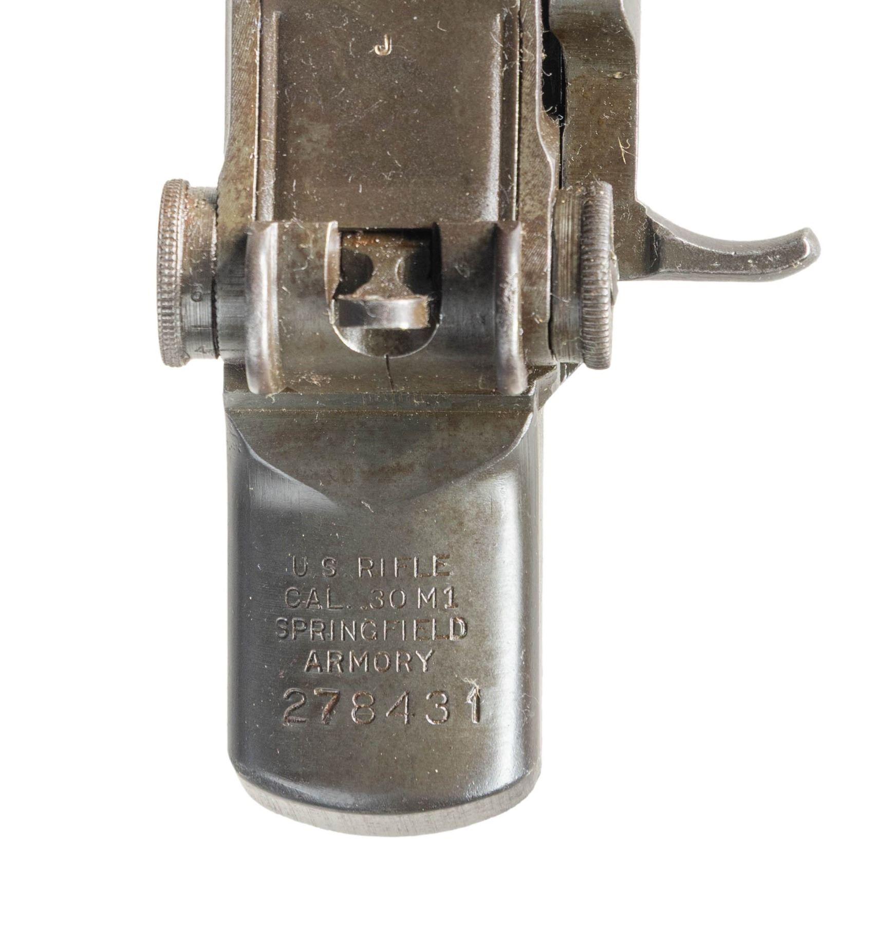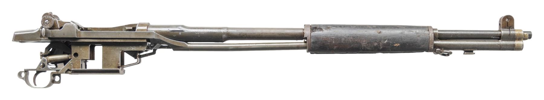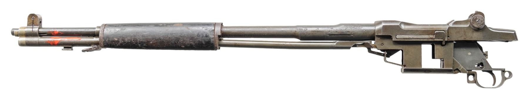 Cal. 30-06. S# 278431. Bbl. 24". Throat gauges less than 1.0. Muzzle gauges 2.5. British export marks found on left side of barrel. Flush-nut rear sight w/ battle range elevation knob. Blade front sight w/ protective ears. Rifle has area of red paint on left side of barrel & gas cyl. No visible US import mark. All visible parts markings, including trigger assembly, are "SA". Operating rod does not have the relief cut. Milled trigger guard. Rifle equipped w/ walnut forward handguard, barrel band & ferrule. Gas cyl. w/ sling swivel. Gas cyl. lock & single slot lock screw are present. CONDITION: metal parts retain 40% of their original wartime finish w/ notable wear & areas of oxidation w/ moderate pitting, most notably on top of the barrel at rear. Handguard extensive wear, handling marks & large missing chip on right side. Handguard ferrule has notable oxidation. Bore is shiny w/ light wear & lightly frosted grooves. (25-2923/RW). MODERN. $300-500.