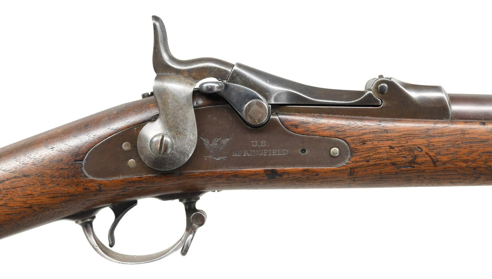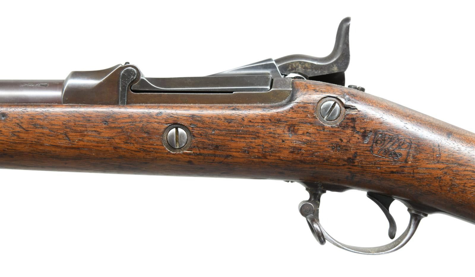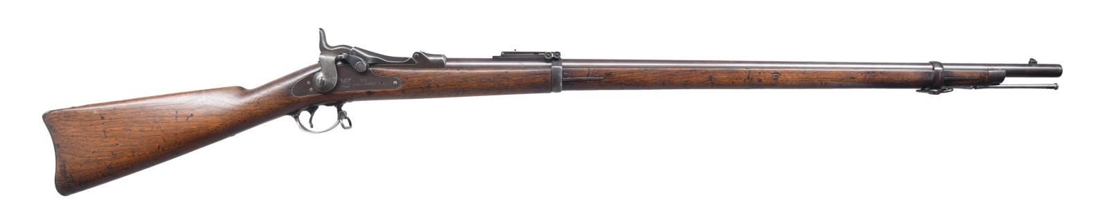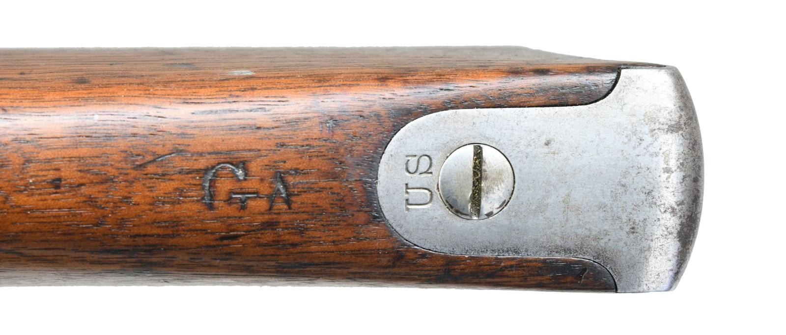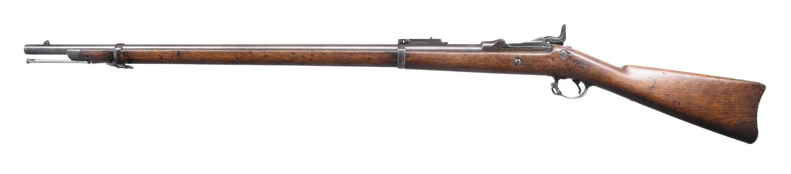 MILITARY RIFLE. Cal. 45-70. S# 438997. Bbl. 32". Bbl. marked at top left rear w/ "eagle VP" proof plus "P". Buffington rear sight marked "R". Blade front sight. Low arch breech block dated "1884". Flat lockplate marked w/ "U.S. SPRINGFIELD" plus eagle. 3 click tumbler. Walnut stock w/ legible box "SWP" & dated "1888". Encircled script "P" is partially legible behind trigger guard. Stock is marked at heel w/ partial "GA". "U.S." marked buttplate. Upper band w/ stacking & sling swivel. Late type ramrod has been polished. CONDITION: stock set has well worn arsenal rework finish w/ softened edges w/ scattered handling marks throughout. Metal turning gray & patina w/ notably polished arsenal rework type finish. Bore is shiny w/ worn lands & hint of frosting in grooves. (01-23757/RW). ANTIQUE. $400-600.