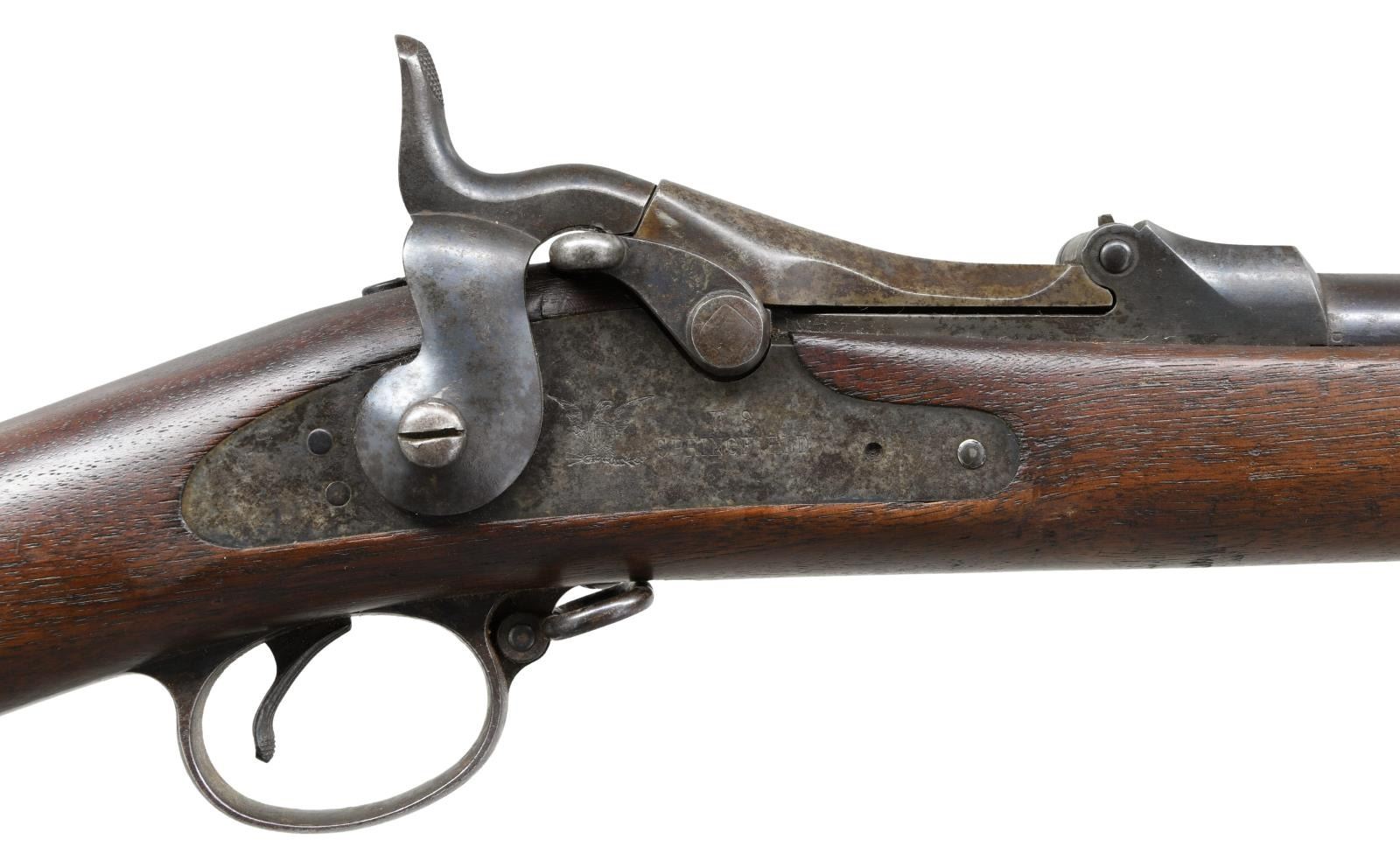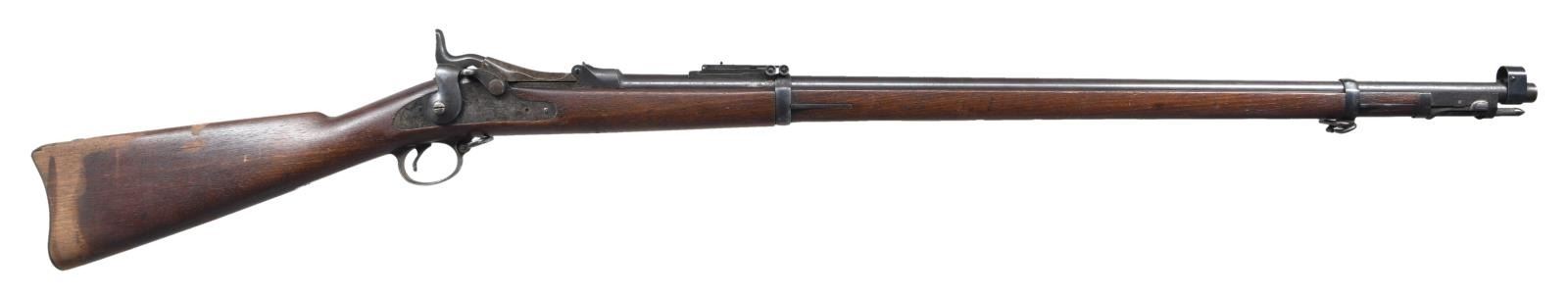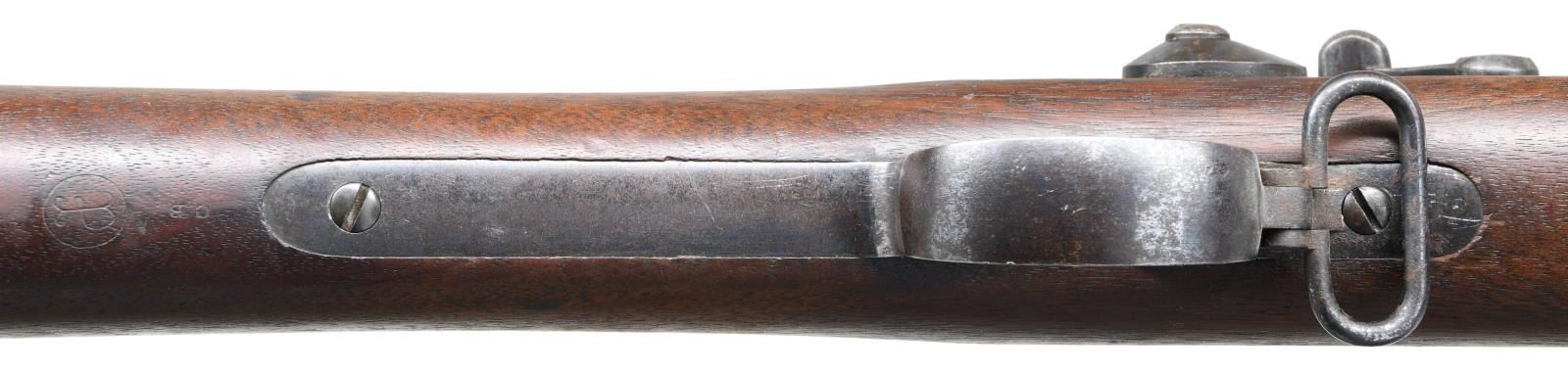 SHOT MILITARY RIFLE. Cal. 45-70. S# 507904. Bbl. 32 1/2" marked on left side w/ "VP" eagle proof. Buffington rear sight graduated to 2000 yds. Marked "R" in top right corner. Blade front sight w/ blued steel front sight cover. Low arch breech block marked "US MODEL 1884". Flat lockplate marked w/ "U.S. SPRINGFIELD" & eagle. 3 click tumbler. 1 piece trigger guard. 35 1/2" ramrod bayonet. Upper band carries stacking & sling swivels. Walnut stock set. Crisp legible markings include boxed "SWP 1890" & encircled script "P" proof plus "CB" near proof mark. "US" marked buttplate w/ trap. CONDITION: long comb stock is in good overall condition w/ light wear & scattered handling marks except lg. areas of buttstock have comb & toe finish removed to bare wood. Metal retains 60% original blue finish w/ light wear & peppery oxidation. Breech block retains a good degree of original case colors. Front sight hood has notably more blue than balance of rifle. Bright shiny bore w/ sharp lands. PROVANANCE: from the estate collection of Thomas J. Mulligan. (01-23384/RW). ANTIQUE. $700-1,000.
