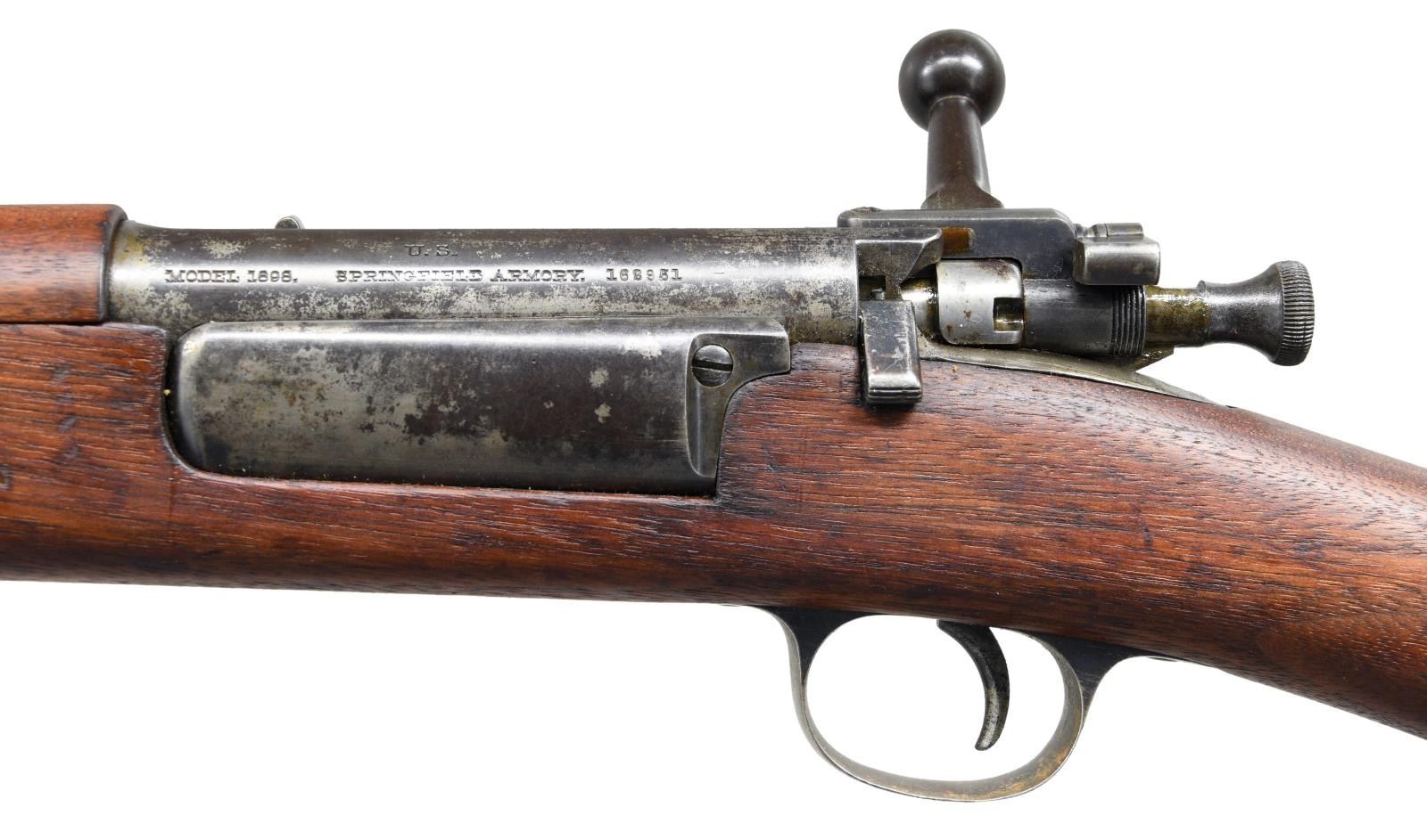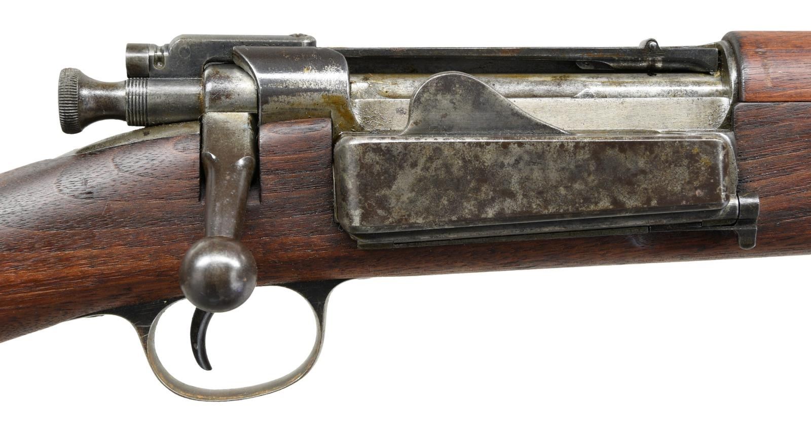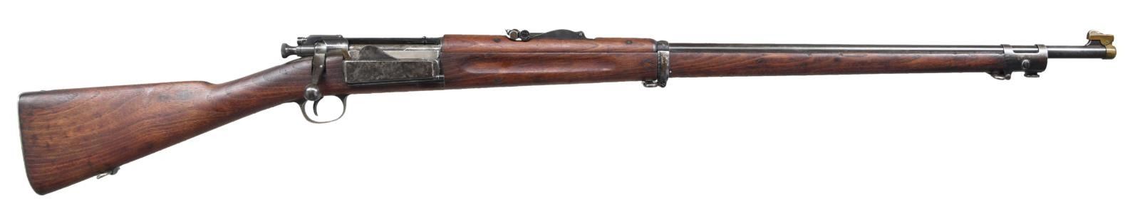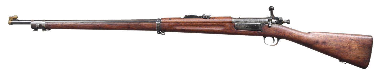 MILITARY RIFLE. Cal. 30-40 Krag. S# 162951. Bbl. 30". Model 1902 tangent rear sight w/ sliding peep. Blade front sight. All milled furniture. Smooth trap buttplate. Walnut stock set. UNATTACHED ACCESSORIES: original brass muzzle cover. CONDITION: stock set has arsenal rework type finish w/ slight loss of wood in inletted areas while retaining light wear & handling marks. Metal retains traces of original blue turning gray w/ wear & scattered handling marks. Fair bore w/ worn lands. PROVENANCE: from the estate collection of Thomas J. Mulligan. (23-1242/RW).CURIO. $400-600.