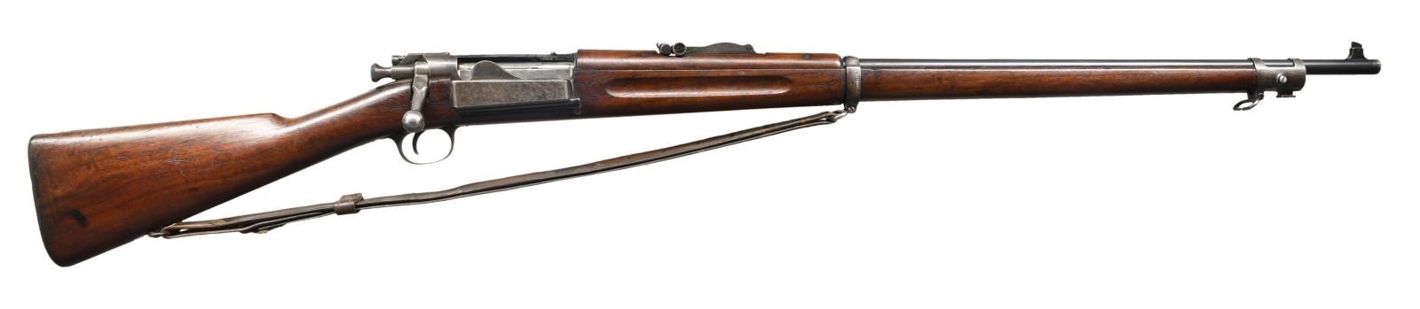 MILITARY RIFLE. Cal. 30-40 KRAG. S# 431152. Bbl. 30". 1902 Rear sight graduated to 2000 yards w/ sliding peep. Blade front sight. Walnut stock set. Smooth trap buttplate. Stock is likely period replacement & is marked only w/ "46" behind trigger guard. Correct period single hook leather sling. CONDITION: stock set has light wear, staining & scattered handling marks throughout. Metal has traces of blue turning gray & patina w/ light wear & scattered spots of light oxidation. Bore has strong lands turning dark in grooves. (23-2236/RW). CURIO. $500-800.