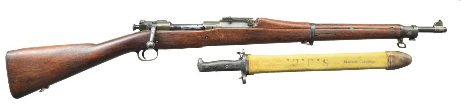RIFLE W/ MODEL 1905 BAYONET. Cal. 30-06. S# 75117. Bbl. 24" marked behind front sight “R.I.A.” “flaming bomb” & “11-11”. Ladder rear sight graduated to 2850 yards. Dished grooved elevation knob. Lg. flat windage knob. Blade front sight. Rifle likely originally mfg. as a rod bayonet model, then rebuilt. Replacement Model 1903 A3 bolt marked “R” under bolt handle. Safety & mag. cutoff have serif letters. Unmarked walnut stock set w/ 2 recoil bolts. Fine checkered trap buttplate. Handguard has sighting groove & 2 clips. UNATTACHED ACCESSORIES: Model 1905 bayonet w/ 15-7/8" blued fullered blade. Left Ricasso marked “SA” “flaming bomb” & “1913”/ Right Ricasso marked w/ “U.S.” & “S#”. Corrugated walnut grips. Model 1910 Khaki canvas scabbard. Scabbard has belt hook sewn-in plain canvas tab. Russet leather tip. Scabbard is marked on front & back w/ “S. J. CATHERINA” & “S.J.C.” Blade has spots of missing blue w/ oxidation & fine pitting. Balance of metal has traces of blue turning gray. Grips are well worn & stained. Canvas scabbard has shrinking at throat & wear & staining throughout. Stitching is tight. CONDITION: replacement stock set has light wear, scratches & handling marks. Notably thin finish in comb area & 2 fine cracks approx. 3/4" behind receiver tang. Metal has worn thinning Parkerized finish w/ spots of light oxidation & scattered handling marks throughout. Trigger has been modified to single state pull. Good shiny bore w/ lightly worn lands. (22-4167/RW). CURIO. $700-1,100.
