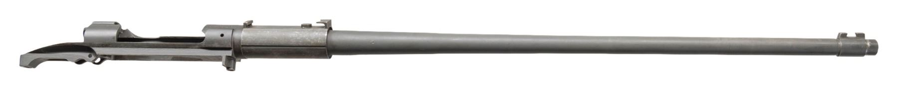 Cal. 30-06. S# 1495613. Bbl. 24". Barrel marked behind front sight base "SA / flaming bomb / 7 24". Receiver has no additional parts. Barrel is fitted w/ rear sight base w/o lightening cuts. Front sight base is installed. CONDITION: receiver has 90% of its arsenal rework dark parkerized finish. Sight bases on barrel shows amateur gunsmith installation & improper use of tools. Barrel has been recrowned & barrel also has wrench-marks at bottom near rear sight base. Very good shiny bore w/ sharp lands. (25-2975/RW). MODERN. $100-200.
