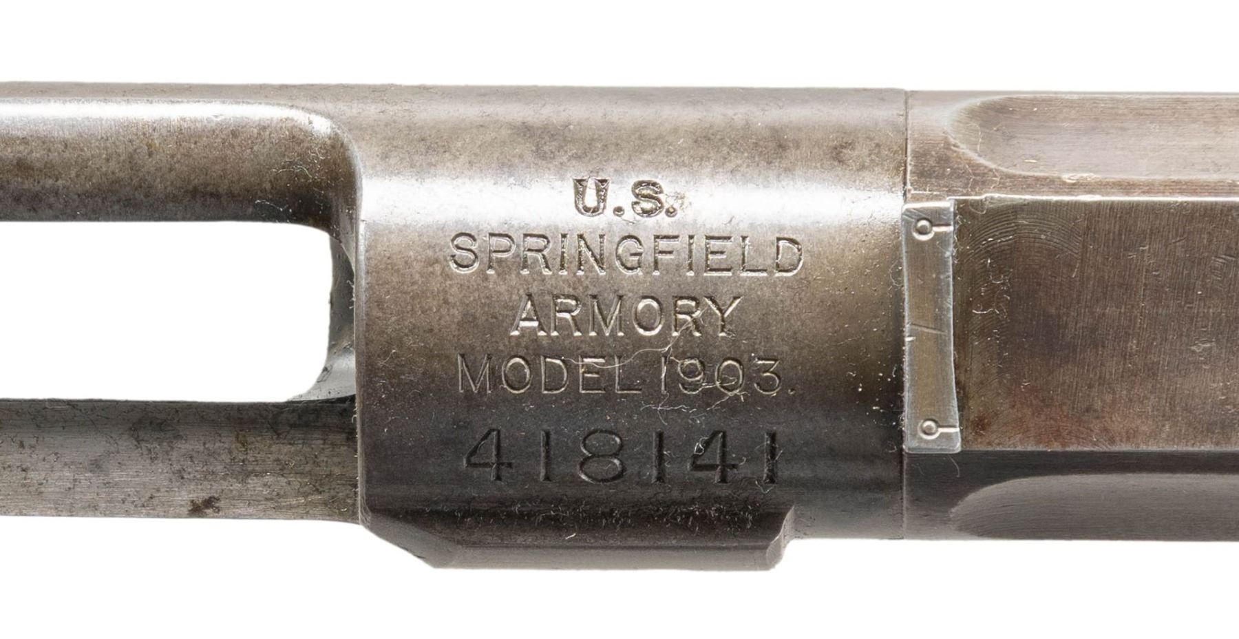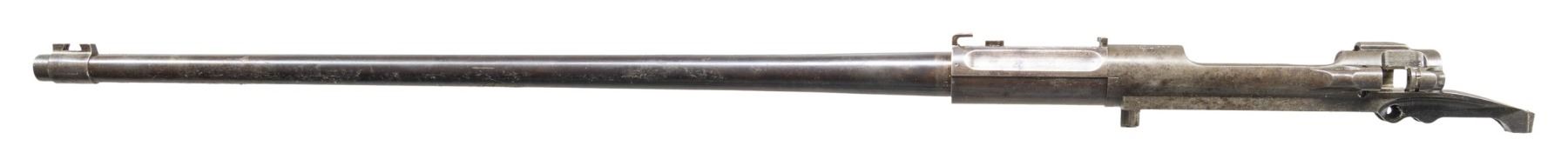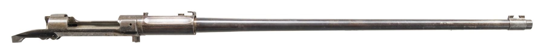 Cal. 30-06. S# 418141. Bbl. 24". Barreled receiver w/ sight bases is 1910 production as indicated by the serial number & the barrel markings behind the front sight which are "SA / flaming bomb / 4-10". The barrel is fitted w/ sight bases. The receiver carries no additional parts. The assembly was likely removed from rifle given the condition & wear patterns. CONDITION: receiver has a mottled gray appearance retaining only traces of its original blue. Barrel retains 30% of its original blue turning gray & patina w/ thinning & light wear. Worn lands w/ lightly frosted grooves. (25-3025/RW). MODERN. $100-200.