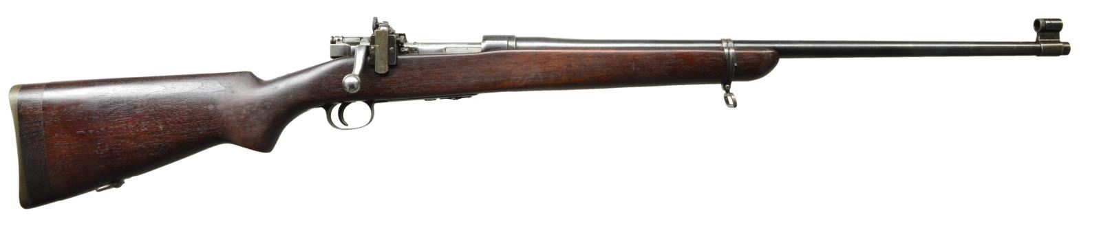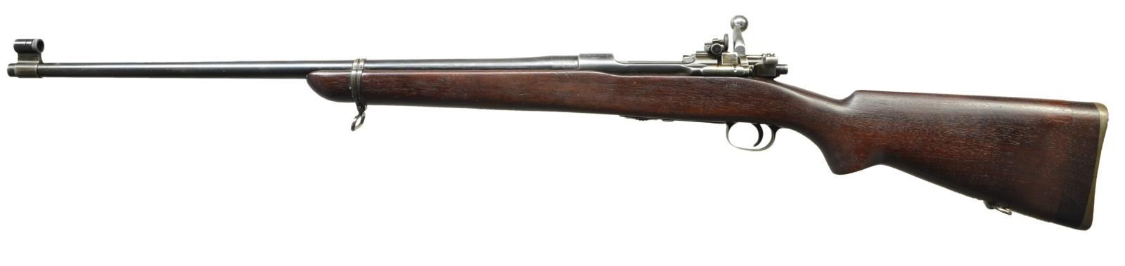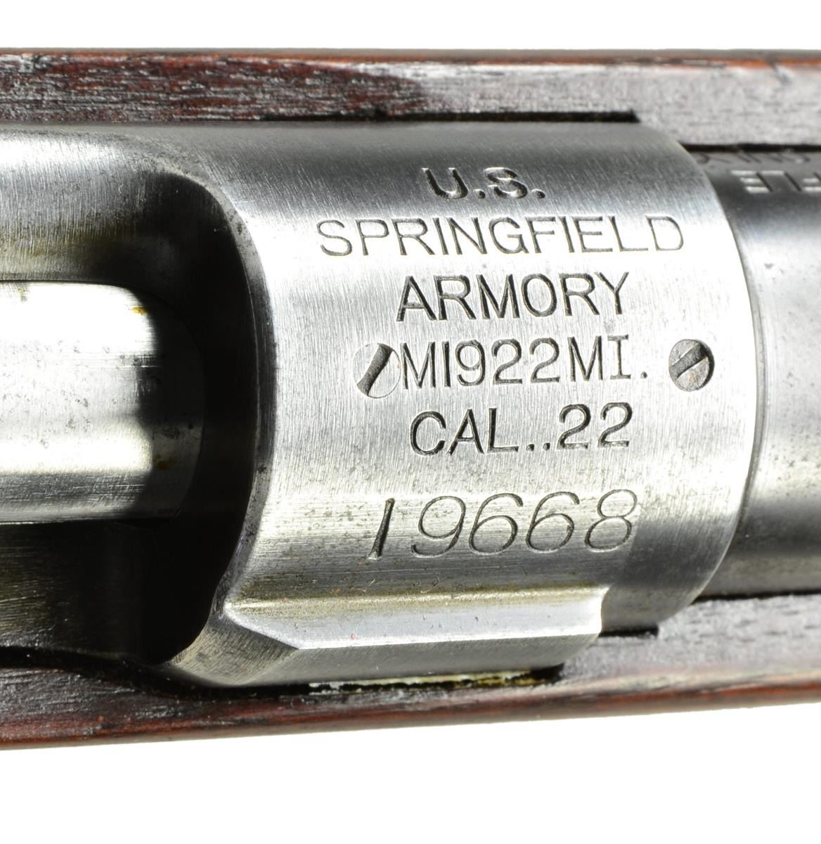 CALIBER RIFLE. Cal. 22 LR. Ser. #19668. Bbl. 24-1/2" marked behind front sight "SA" "flaming bomb" & "3-30". Receiver markings include "M1922M1" & "CAL. .22". Bbl. is marked on left side over chamber w/ "LONG RIFLE CART'GE ONLY". Lyman 48 receiver sight w/ matching numbers graduated to 125 points. Sm. knobs. Screw-in target type aperture. Fixed base is fitted w/ unmarked globe target sight w/ aperture disk. Receiver ring & bbl. drilled for scope blocks. Spacing is approx. 7-1/4". Holes in bbl. are approx. 9/16" center to center. Holes in receiver ring are approx. 7/8" center to center. Bolt head & body w/ extractor & ejector are polished bright. Does not have headspace adjustment. Bolt handle is marked "NS". Headless cocking piece. Walnut stock is unmarked w/o grasping grooves. Buttstock has added walnut extension giving an overall length of pull of approx. 13-5/8". Extension measures approx. 1-1/8". Deeply checkered shotgun style Springfield buttplate. Grooved trigger. MAGS: 1 unmarked blued steel 5-rd. mag. CONDITION: stock has lg. degree of original finish w/ light wear & scattered handling marks. Stock extension has been professionally fitted & has lightly worn appearance. Metal has 75% thinning original blue finish w/ light wear & scattered sm. handling marks. Very good shiny bore. (22-4189/RW). MODERN. $600-900.