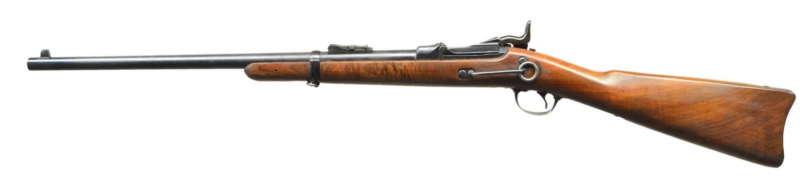 CARBINE. Cal. 45-70. Ser. #146918 . Bbl. 22-1/4". Carbine was made by cutting a rifle bbl. to carbine length & making a new one piece blade front sight. Rear sight is Model 1873 rifle type. Low arch breech block is dated 1884. 3 position tumbler. Long comb walnut stock w/ sling bar, saddle ring & 2 piece trigger guard. After market stock has been given "SWP 1875" inspector's mark & circle "P" proof. U.S marked buttplate. Bbl. band has stacking swivel. CONDITION: buttstock has good condition w/ light wear, handling marks & visible sanding marks. Inletted areas have glass bedding & hobbyist type workmanship. Polished metal retains lg. degree of refinished blue. Very good shiny bore. (01-21408/RW) ANTIQUE. $300-500.
