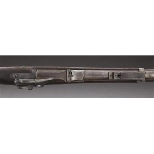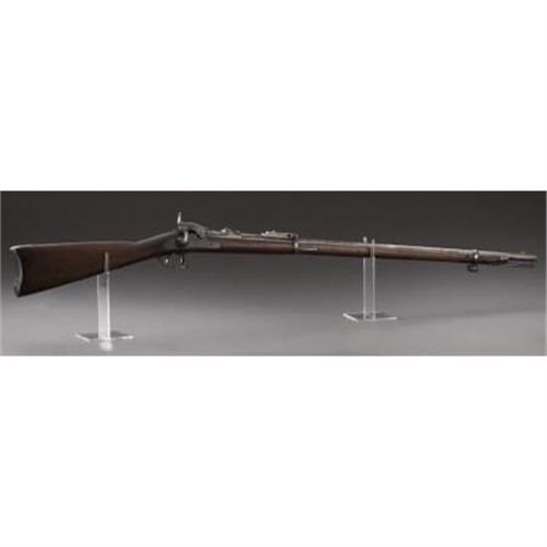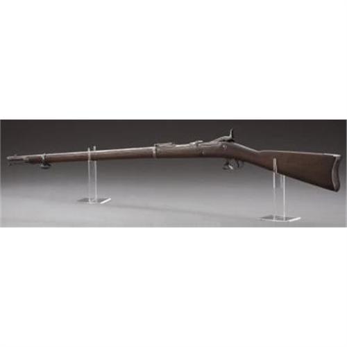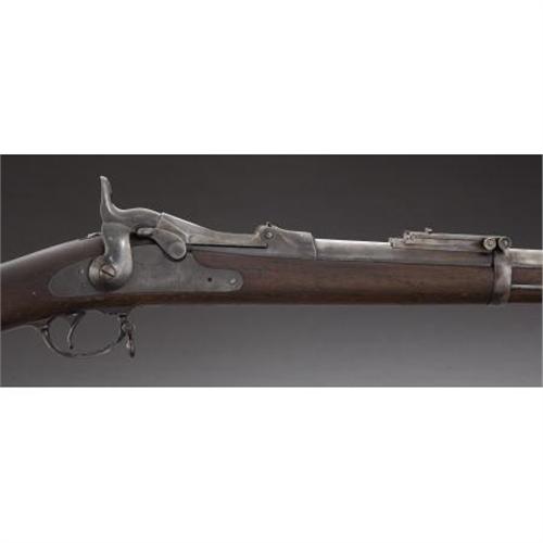 <B>U.S. SPRINGFIELD 'TRAPDOOR' RIFLE</B></I> - Serial number 374812, .45-70 calibre. Composite rifle: early 1873 lock plate, second style 1873 breach block, 1884 style rear sight, second style stock with long comb. Functioning action.<BR><BR><B>Condition:</B></I>Receiver, hammer, and front barrel band re-blued. Butt plate heavily pitted. Barrel cleaned and relatively uniformly pitted. Wood has been sanded smooth and recolored. 1873 lock plate looks to have about 95% original blue finish intact.<BR><BR><b>Shipping:</b> Bats, Clubs, Sticks, Swords, Rif (<a target="_blank" href="http://www.heritageauctions.com/common/shipping.php">view shipping information</a>)