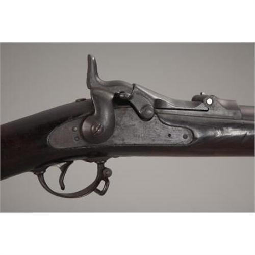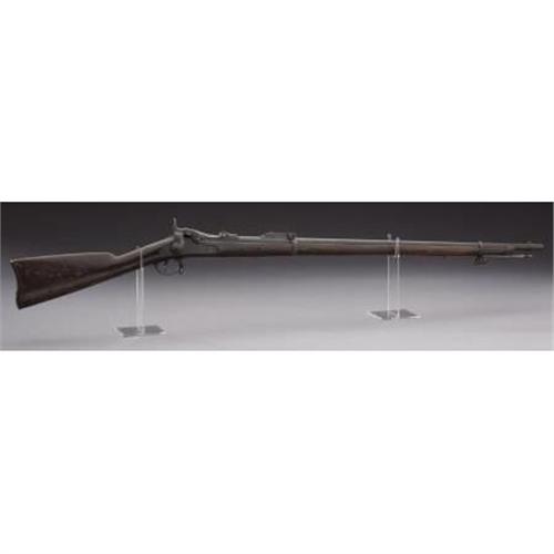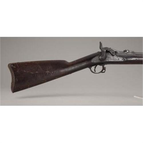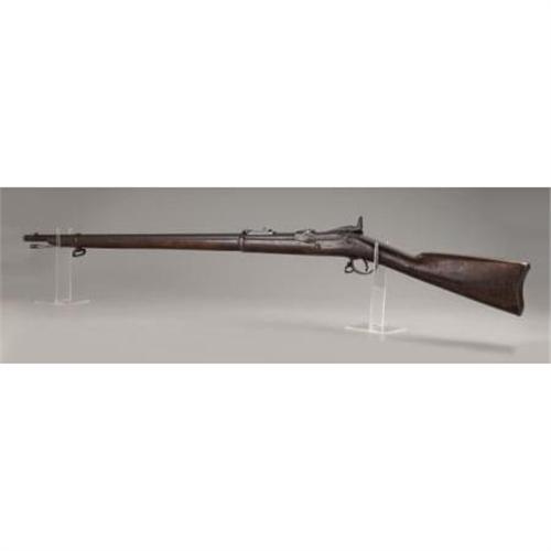 <B>U.S. SPRINGFIELD 'TRAPDOOR' RIFLE, MODEL 1879.</B></I> Serial number 134342, .45-70 calibre. All features as standard for this rifle with the exception of the breach block pin and ramrod.<BR><BR><B>Condition:</B></I> All metal surfaces have turned dark brown to black with age. Old splinter on stock at left wrist. Additionally, wood chipped on left side where stock lays next to frame breach block pin. No visible cartouches. Of note, this rifle is fitted with an early 1st model stock.<BR><BR><b>Shipping:</b> Bats, Clubs, Sticks, Swords, Rif (<a target="_blank" href="http://www.heritageauctions.com/common/shipping.php">view shipping information</a>)