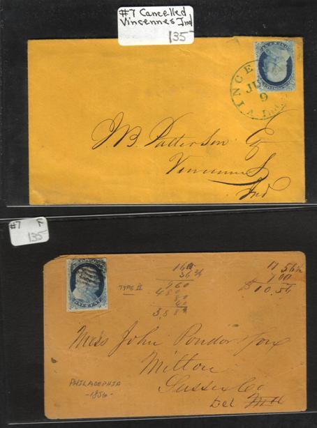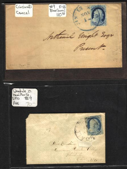 Useful lot of (2)covers bearing U.S.Scott #7 and two more bearing single Scott #9's. One is #9 F-VF on cover blue Cincinnati cancel, #9 on Glendale Ohio DPO cover, #7 with Vincennes Indiana cds and a #7 with black grid cancel. 2009 SCV.$700