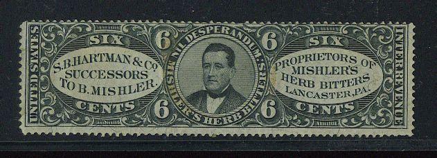 Rare stamp, U.S.Scott RS100b, S.B.Hartman & Co. 6 cent black, Used with F-VF centering, light creases otherwise sound. Seldom seen this nice. 2009 SCV.$400