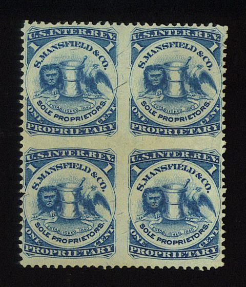 S.Mansfield & Co. block of 4 imperf between, U.S.Scott RS174jb, Used with VF centering for this, 1mm perf tear otherwise sound. Rare this nice. 2009 SCV.$500